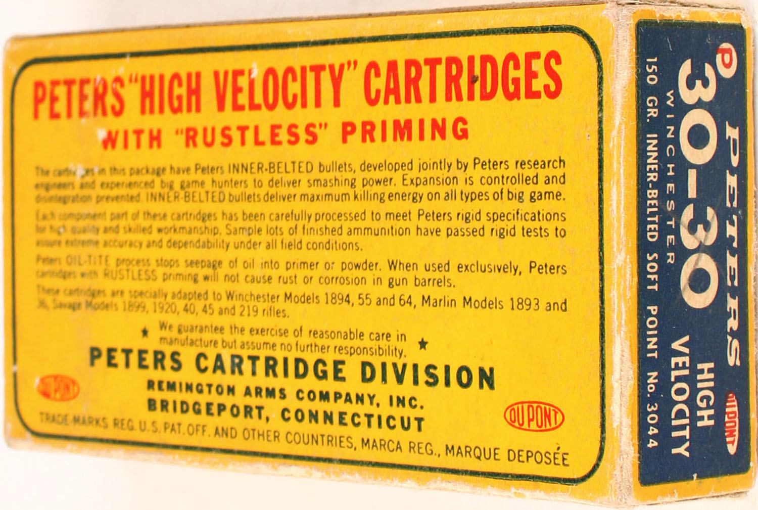 Peters, High Velocity, .30-30 Winchester, 150 Gr. Inner-Belted soft point bullet, smokeless, 1pc, Partial 17 Rds. 8 correct, yellow box with blue/red label & white print, box is missing both inner right side end flaps, pencil marks, rub marks & edge/corner wear, ammo is good. Grade: Very Good ++ - Value: 20 to 60