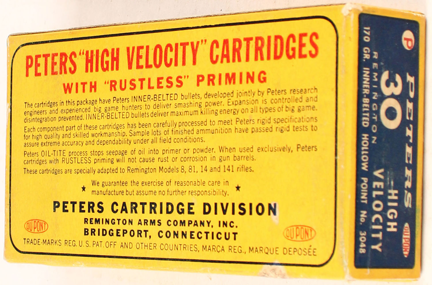 Peters, High Velocity, .30 Remington, 170 Gr. Inner-Belted Hollow Point Bullet, smokeless, 1pc, Full, yellow box with blue/red label & white print, box is solid with rub marks & light corner wear, ammo is excellent. Grade: Excellent + - Value: 80 to 160