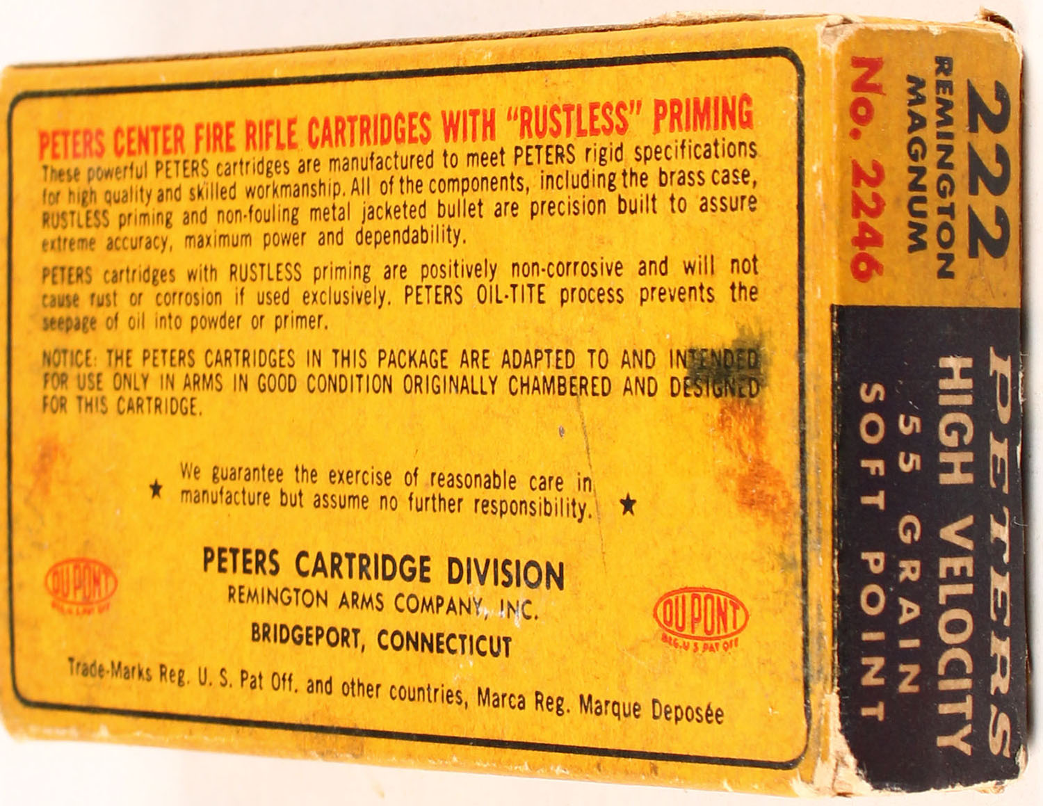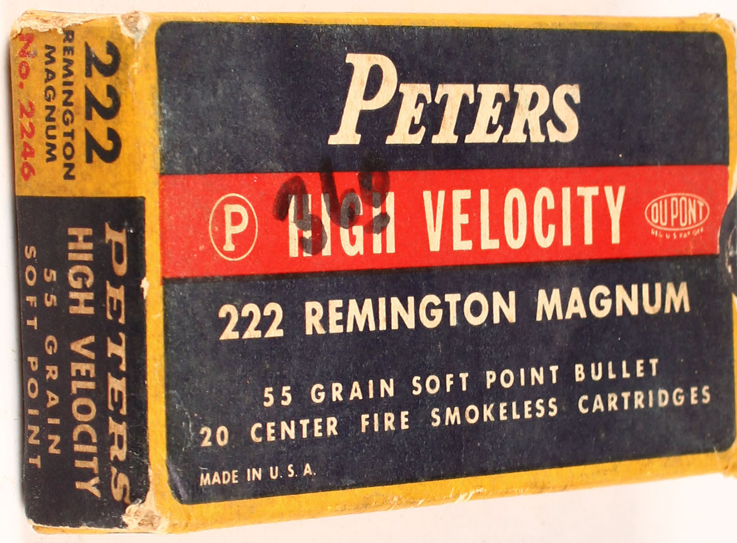Peters, High Velocity, .222 Remington Magnum, 55 Gr. Soft Point Bullet, Smokeless, 1pc, Full, yellow box with blue/red label & white print, box is solid with one right end inside flap detached, light age soiling, pen marks, light rub wear, & light edge/corner wear, ammo is excellent. Grade: Very Good + - Value: 40 to 80