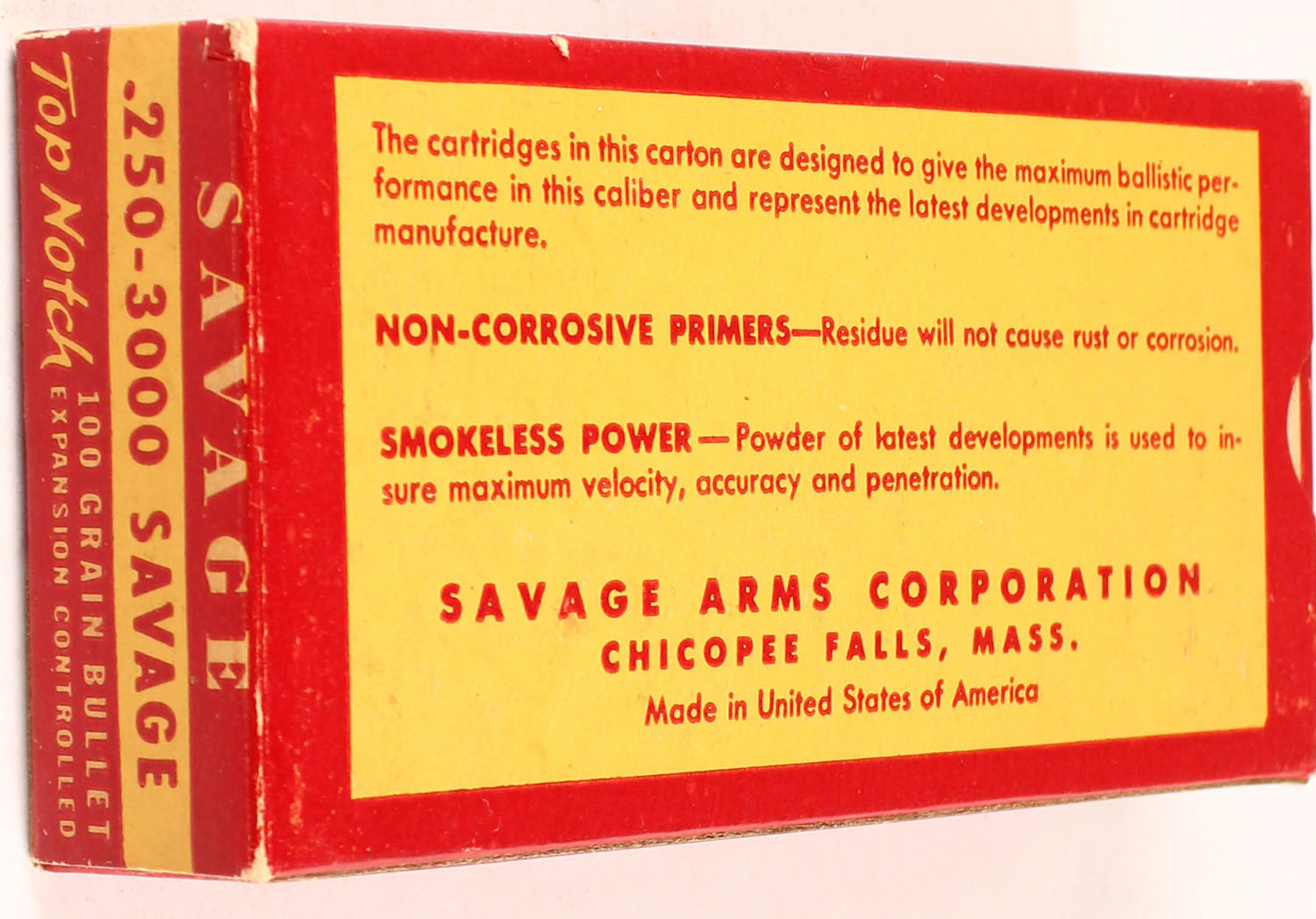 Savage, .250-3000 Savage, 100 Gr. Soft Point Bullet, smokeless, 1pc, Full, red box with yellow label & red/yellow print, box is solid with light rub marks, ammo is excellent. (949) Grade: Excellent ++ - Value: 80 to 160