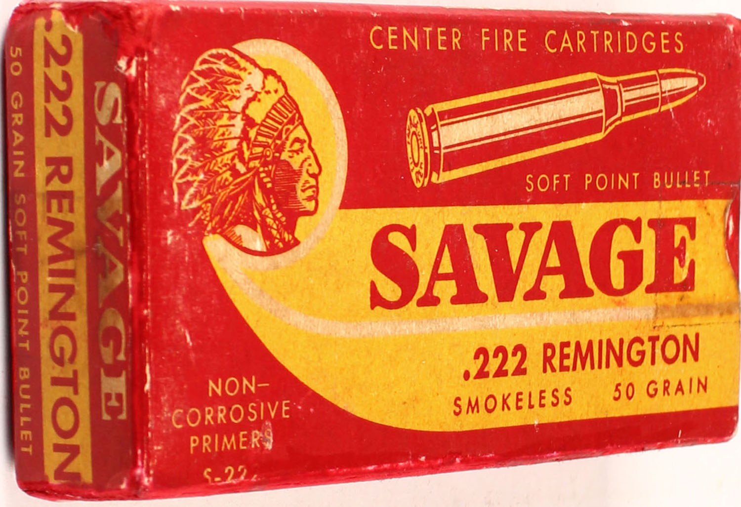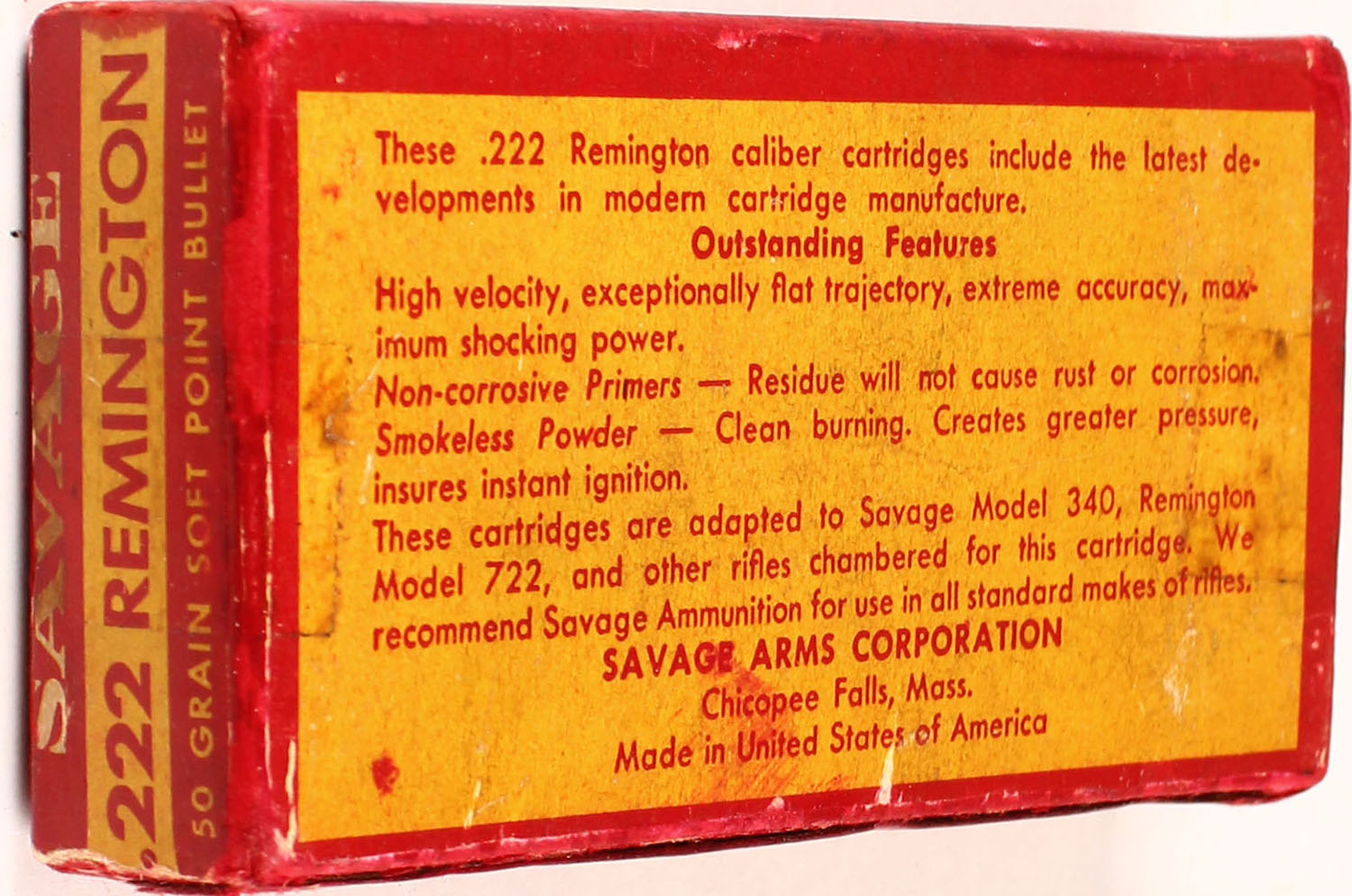 Savage. .222 Remington, 50 Gr. Soft point bullet, smokeless, 1pc, Full, red box with yellow label & red/yellow print, box is solid with tape, light age soiling, light rub marks, & edges & corners have been painted red, ammo is excellent. Grade: Very Good + - Value: 100 to 200