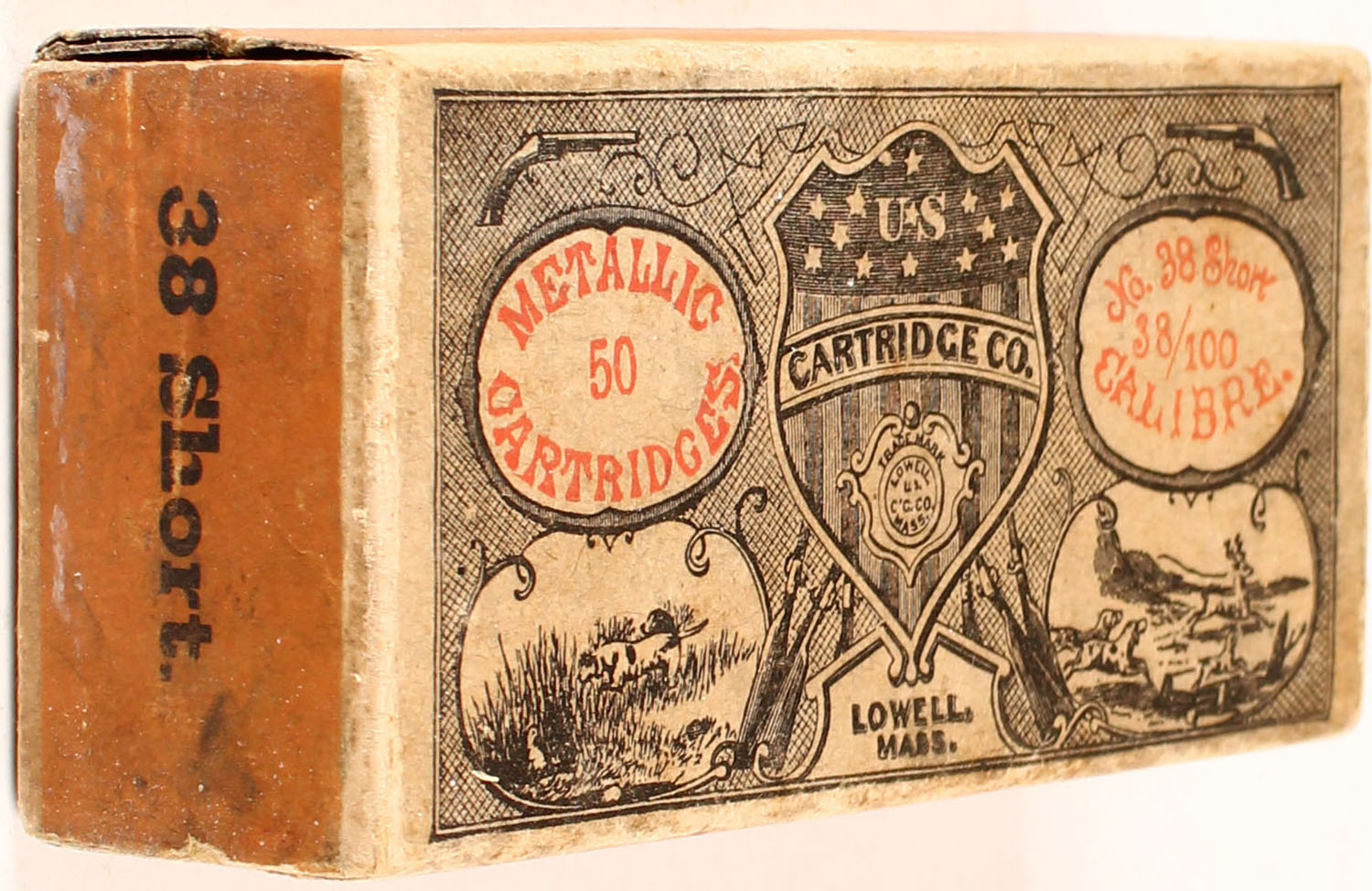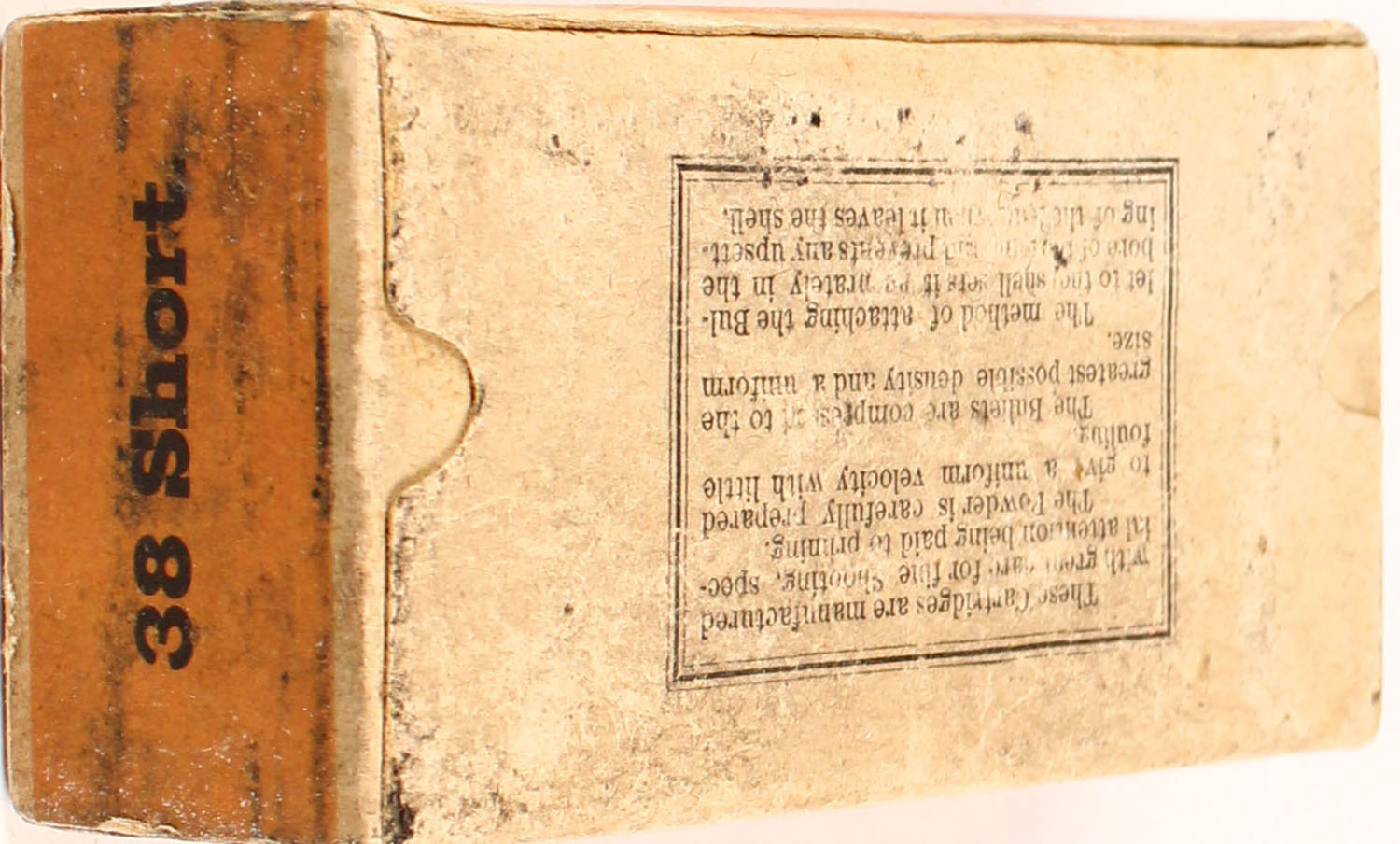 U.S. Cart. Co., .38 Short (38/100) R.F., target cartridges, 1pc, Full, buff box with buff/orange label & black/red print, box is solid with light age soiling, rub marks, & light edge wear, ammo is fair. Grade: Very Good ++ - Value: 20 to 100