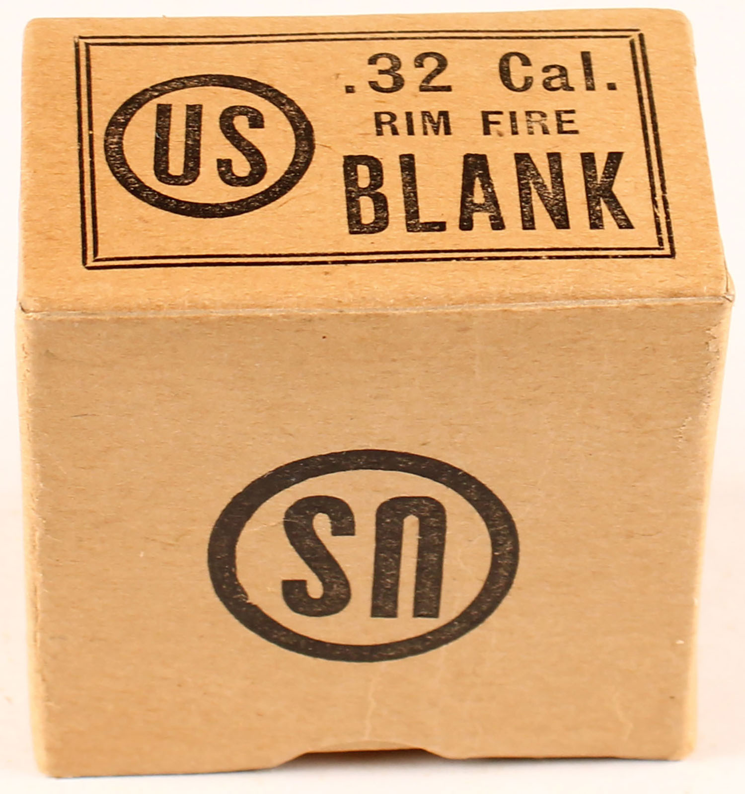 U.S. Cart. Co., .32 R.F., Blanks, 1pc, Full, buff box with black print, box has top flap & one inside flap detached, & has light handling wear, ammo is very good. Grade: Very Good ++ - Value: 10 to 30