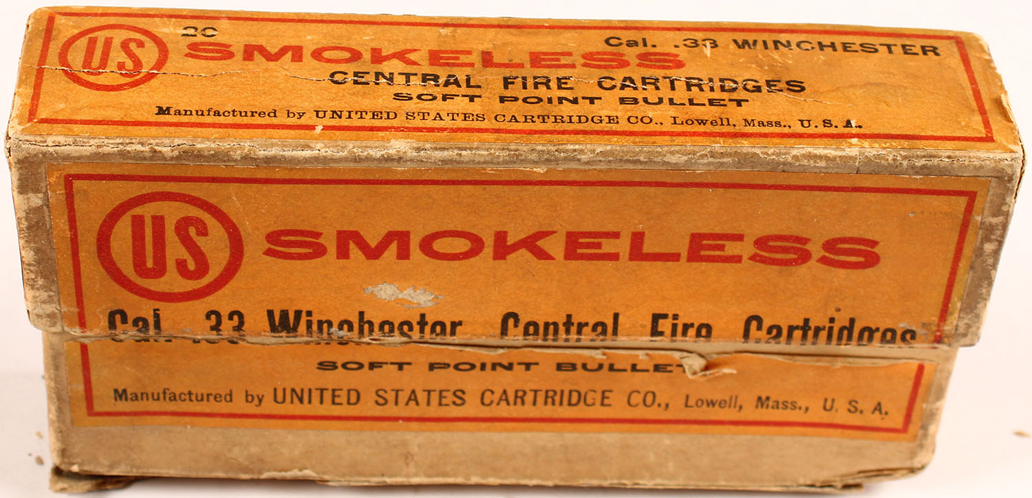 U.S. Cart. Co., .33 Winchester, soft point bullet, smokeless, 2pc, partial 18 Rds., buff box with orange/red label & black print, box has tear on bottom, chunk of box torn out of bottom, split seams, pencil marks, light age soiling, rub marks, & edge wear, ammo is very good with cracks on most cases. Grade: Good ++ - Value: 30 to 150