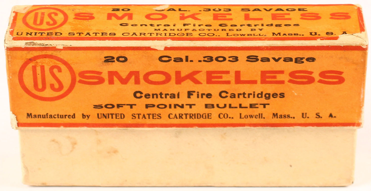 U.S. Cart. Co., .303 Savage, soft point cartridges, smokeless, DU PONT powder company paper inside, 2pc, Full, buff box with orange/red label & black print, box is solid with rub marks & light edge wear, ammo is very good with cracks on the necks of some cases. Grade: Excellent - Value: 50 to 300