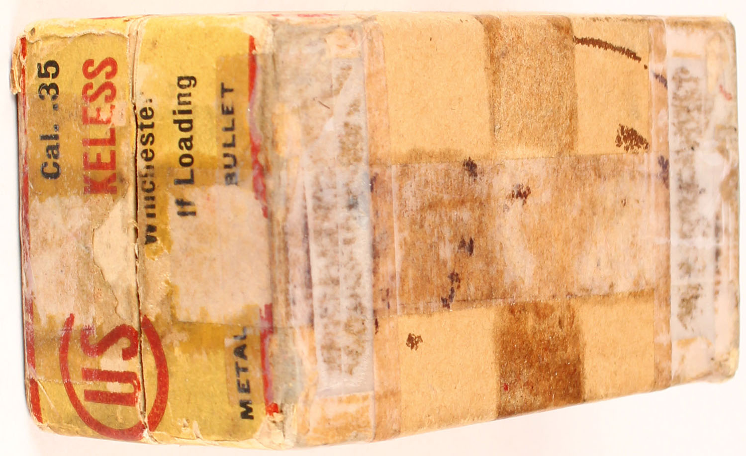 U.S. Cart. Co., .35 Winchester Self-Loading, Metal-Cased Bullet, smokeless, 2pc, Full, buff box with orange/red label & black print, box is solid with tape, light age soiling, light rub marks & light edge/corner wear, ammo ranges from good to fair. Grade: Very Good - Value: 80 to 160