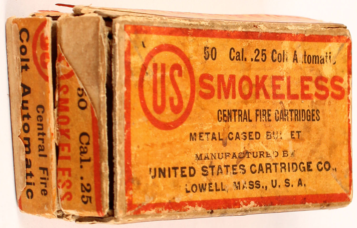 U.S. Cart. Co., .25 Colt Automatic, Smokeless, Central Fire, Metal Cased Bullet, 2pc, Full, orange box with red/black print, box has one detached end flap on lid, multiple torn seams, rub marks, edge wear & age soiling, ammo is excellent. Grade: Very Good + - Value: 24 to 200
