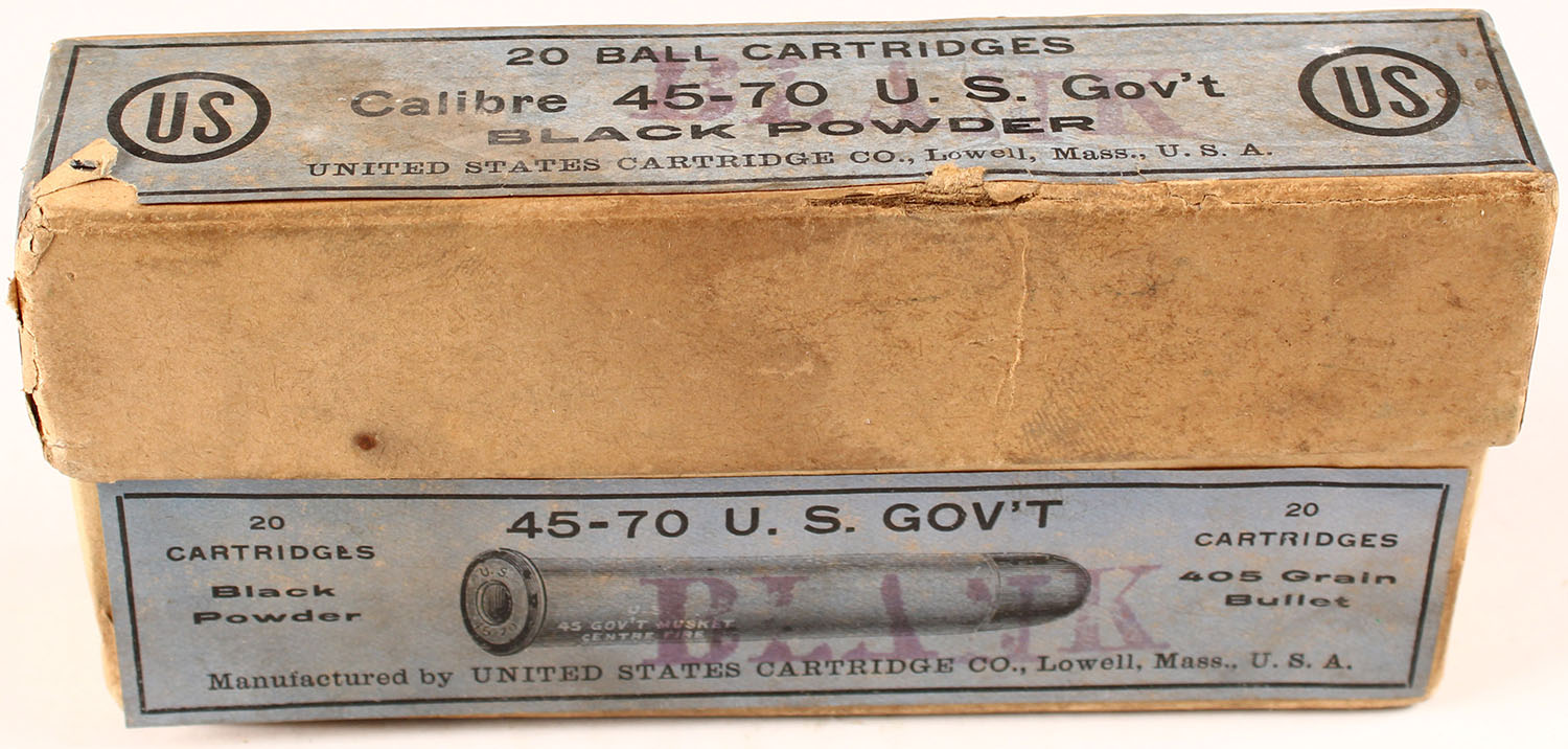 U.S. Cart. Co., .45-70 U.S. Gov't, OVERSTAMP ''BLANK'', Black Powder, 2pc, Full, buff box with blue label & black print, box is solid with factory black out lines on front label, age soiling, rub marks & edge/corner wear, ammo is good. Grade: Very Good ++ - Value: 10 to 40