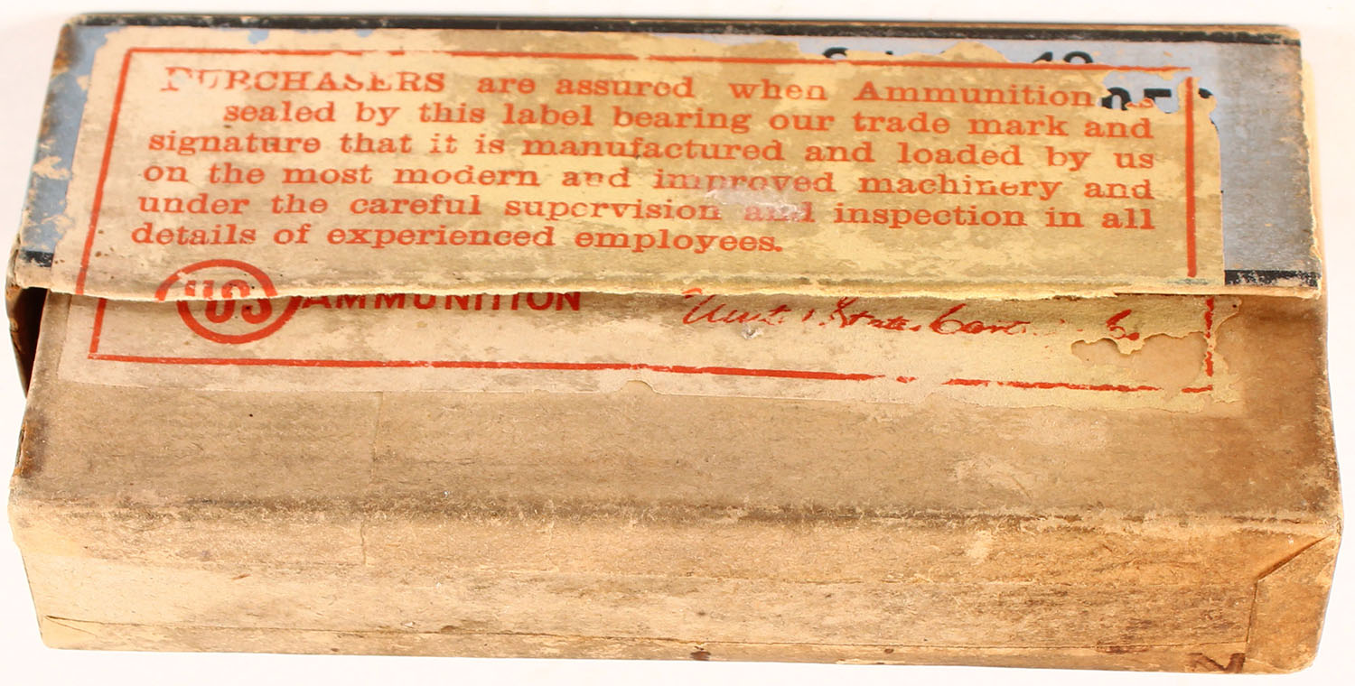 U.S. Cart. Co., .32-40, Black powder, 2pc, Full, buff box with blue label & black print, box is missing left end flap on lid, has one corner seam split on lid, age soiling, rust marks, rub marks & edge wear, ammo range from very good to poor. Grade: Good ++ - Value: 40 to 200