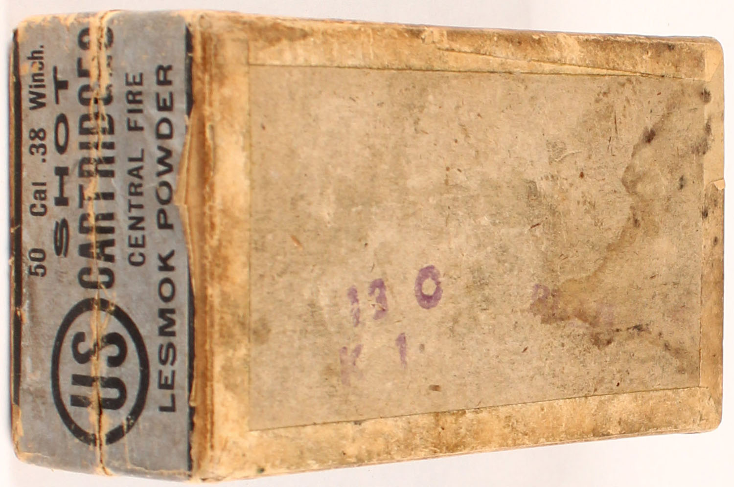 U.S. Cart. Co., .38 SHOT Cartridges for Winchester model 1873 (38-40), 2pc, Full, buff box with blue label & black print, box is solid with light age soiling, rub marks, & edge/corner wear, ammo ranges from excellent to very good. Grade: Very Good ++ - Value: 24 to 200