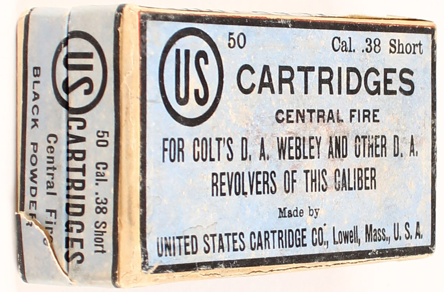 U.S. Cart. Co., .38 Short Central Fire, Black powder, 2pc, FULL & SEALED, buff box with blue label & black print, box is solid with light age soiling, rub marks & edge wear. Grade: Excellent - Value: 50 to 100