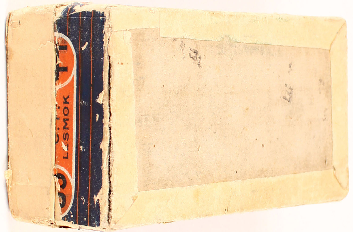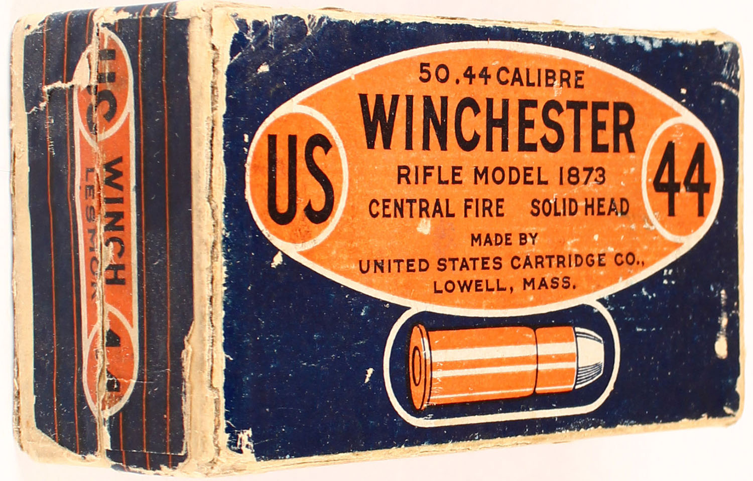 U.S. Cart. Co., .44 Winchester (44-40), Lesmok powder, 2pc, Full, buff box with blue/orange label & black print, box has two split seams & one partial split seam on lid, three split seams on bottom, rub marks, & edge/corner wear, ammo is very good. Grade: Very Good - Value: 80 to 160