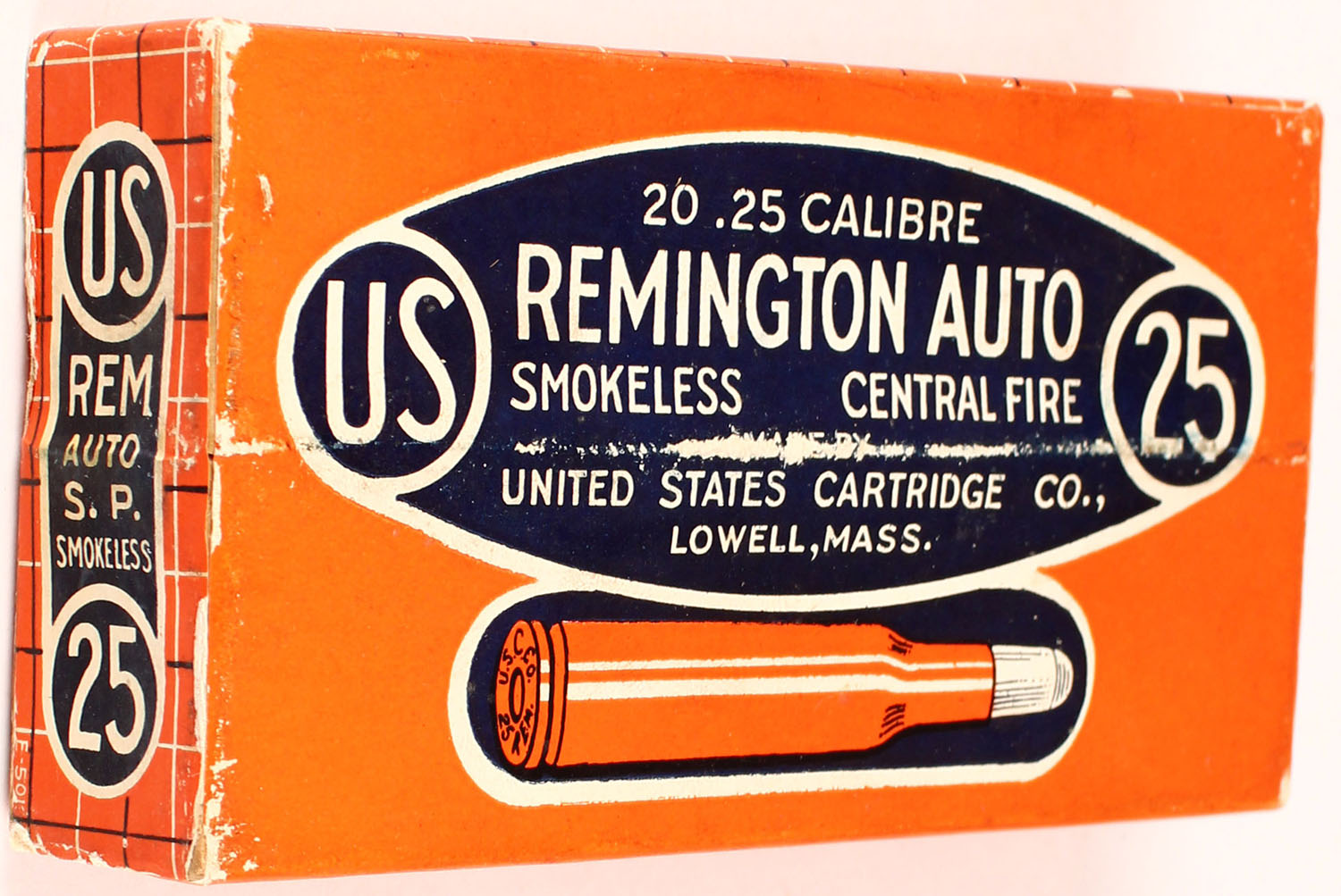U.S. Cart. Co., .25 Cal. Remington Auto, Full & Sealed, 2pc. box is solid, orange, blue & white label has very minor age scuffing. Grade: Excellent + - Value: 75 to 250