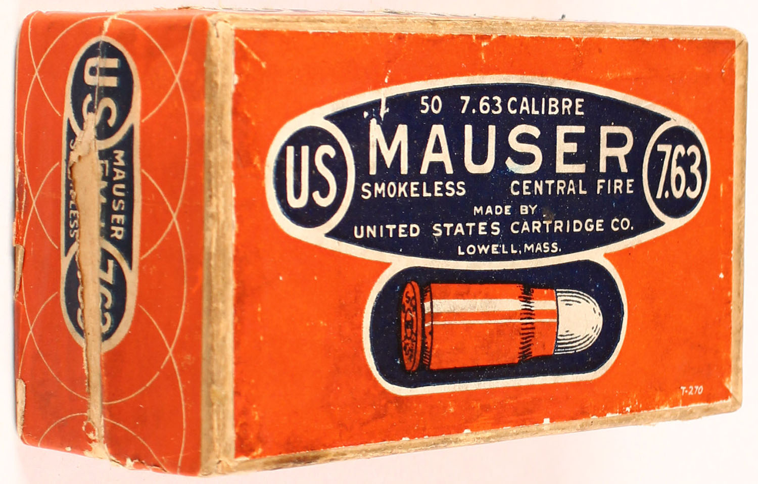U.S. Cart. Co., .7.63 cal. Mauser, Smokeless, Central Fire, 2pc, Full, buff box with orange/blue/white label, box has scuffing and age soiling, ammo is excellent. Grade: Excellent - Value: 30 to 90