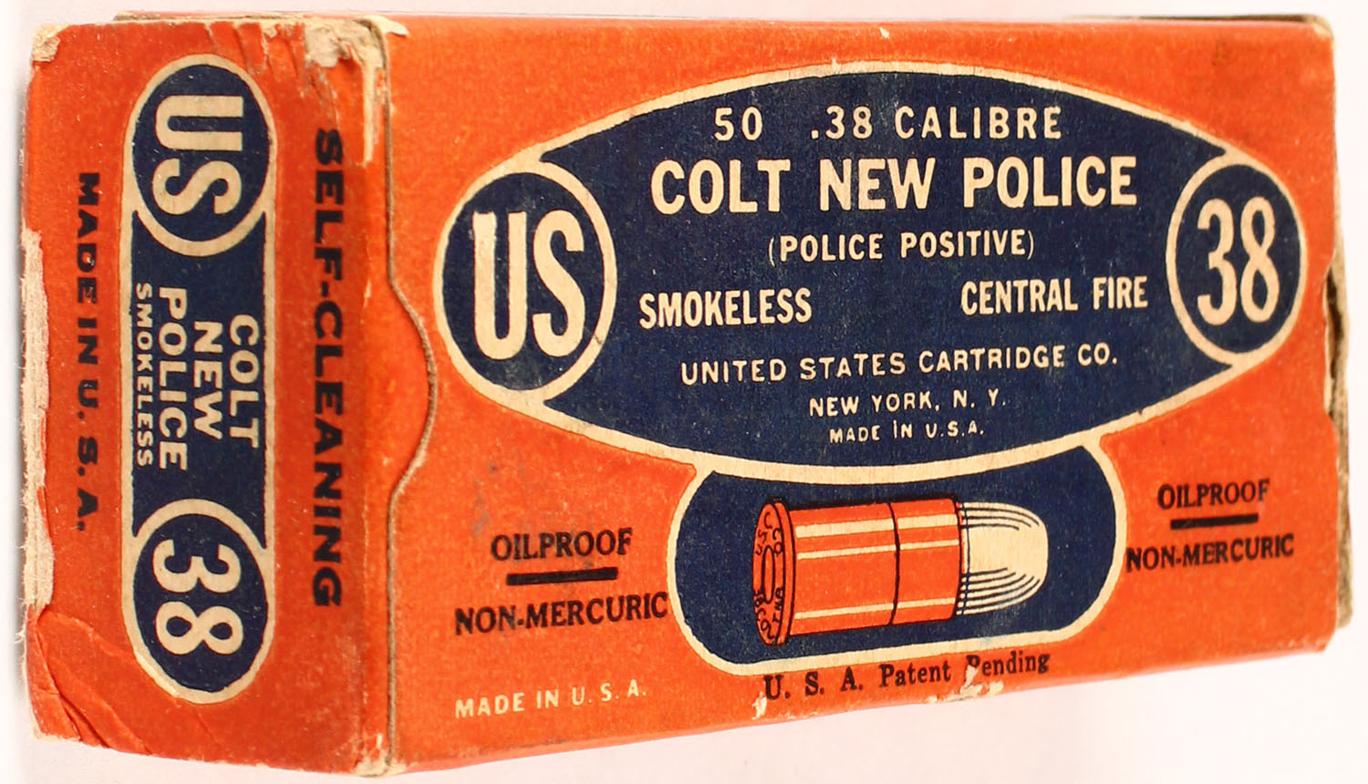 U.S. Cart. Co., .38 Cal. Colt New Police, Smokeless, Central Fire, 1pc, Full, orange box with blue/white box, box has 2 end flap detached, and some light scuffing, ammo is very good. Grade: Very Good - Value: 30 to 90