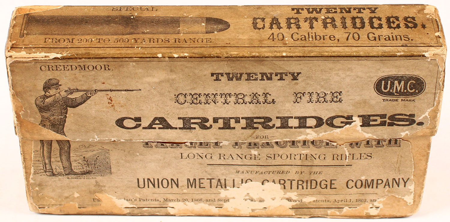 UMC, .40 cal. 70 grains, Creedmoor, FULL, 2pc. Buff box with yellow and black label, box has age soiling and scuffing, ammo is very good. Grade: Very Good - Value: 100 to 500