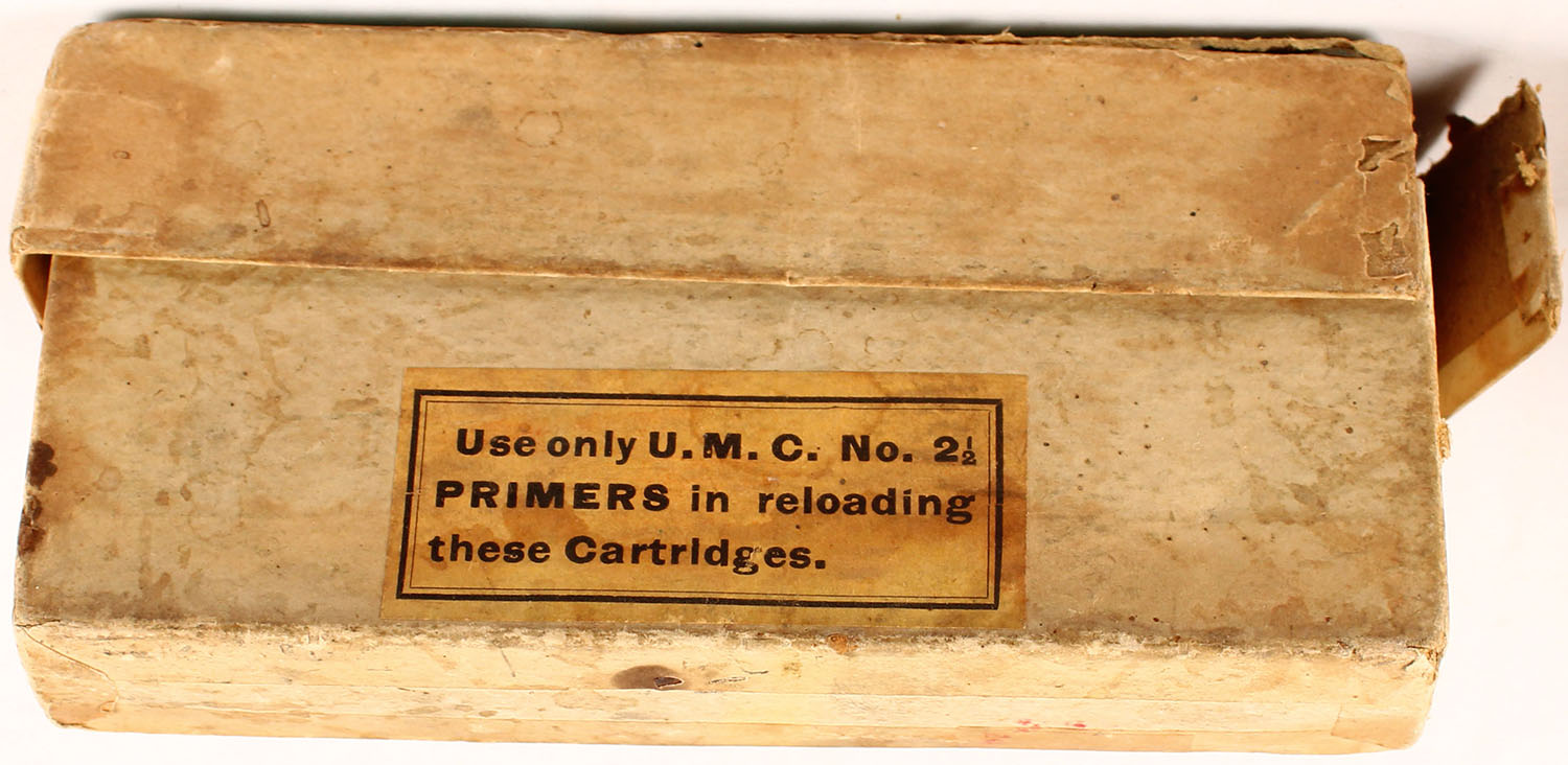 UMC, .45-82 cal., Full, 2pc., buff box with green & black label, box has seam splits to top and labels have age soiling, and scuffing, ammo is very good. Grade: Very Good - Value: 50 to 150