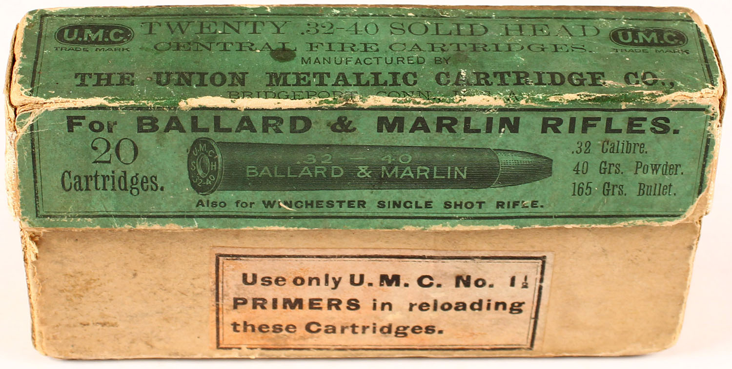 UMC, .32-40 Ballard & Marlin cal., 165 grs. bullet, Full, 2pc., buff box with green & black label, box has repaired seams and labels have minor scuffing and age soiling, ammo is excellent. Grade: Very Good - Value: 40 to 100