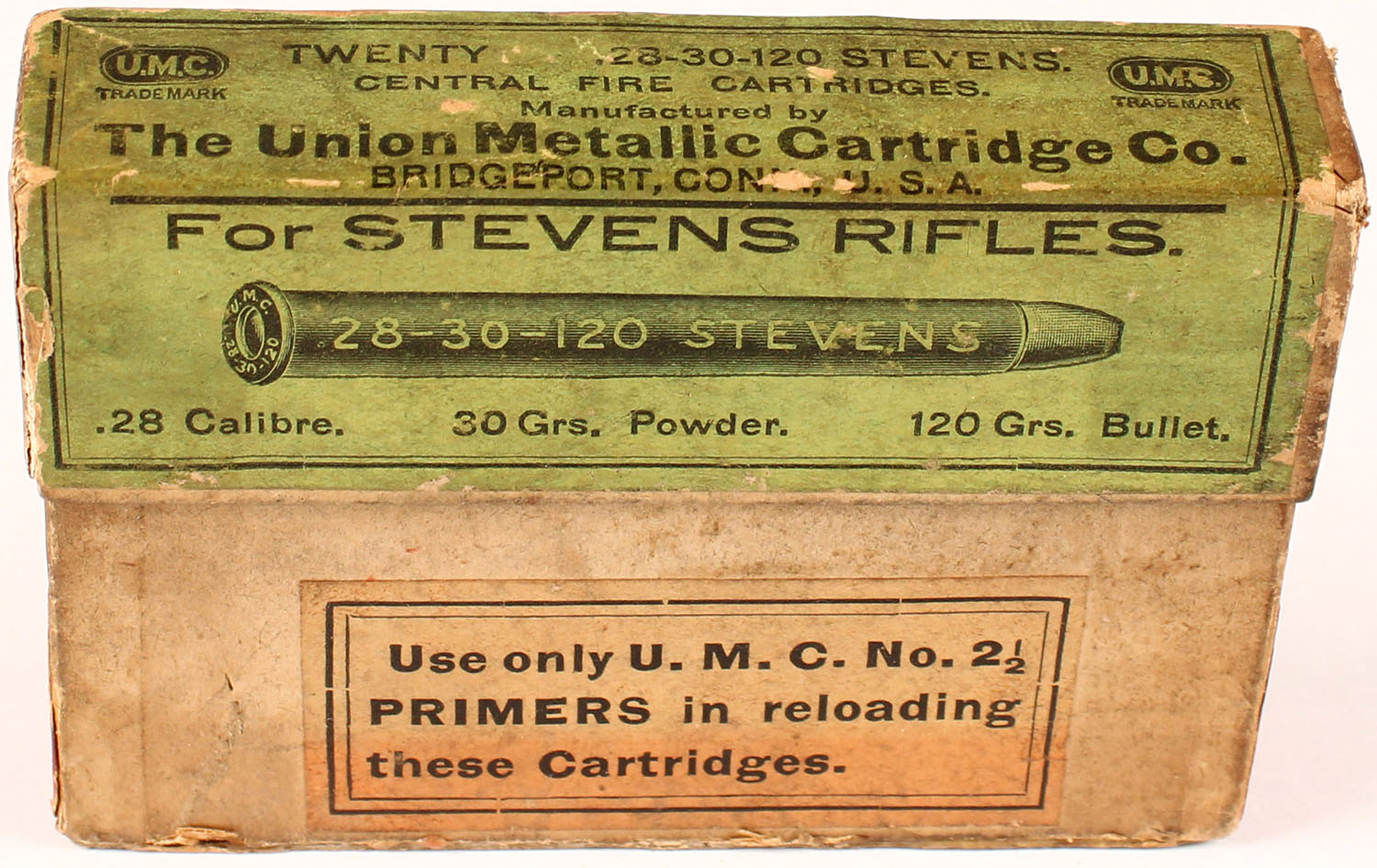 UMC, .28-30-120 cal., 120 grs. bullet, Full & Sealed, 2pc., buff box with green & black label, box has age soiling and labels have minor scuffing and age soiling. Grade: Very Good - Value: 50 to 150