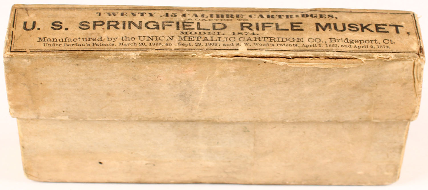 UMC, .45 cal., U.S. Springfield Rifle Musket , 2pc, Full, buff box with black print, box has age soiling and edge wear, ammo is excellent Grade: Very Good - Value: 40 to 200