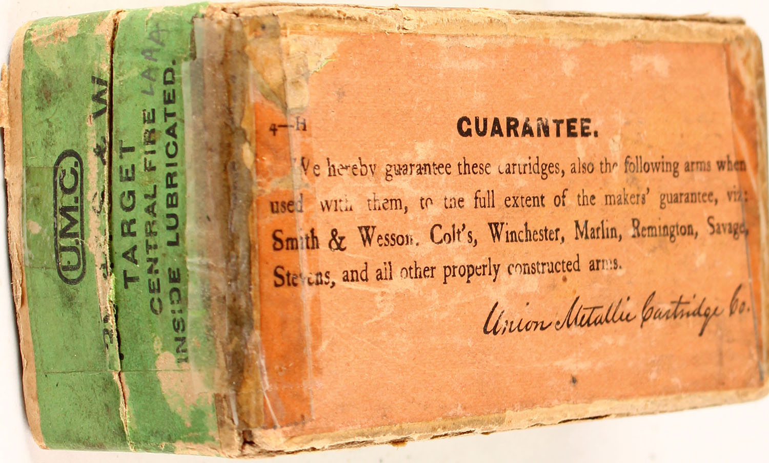 UMC, .38-44 S&W Target, Full, 2pc. buff box with green top & side sealing labels, box has seam splits, labels have scuffing and age soiling, ammo is very good. Grade: Good ++ - Value: 40 to 200