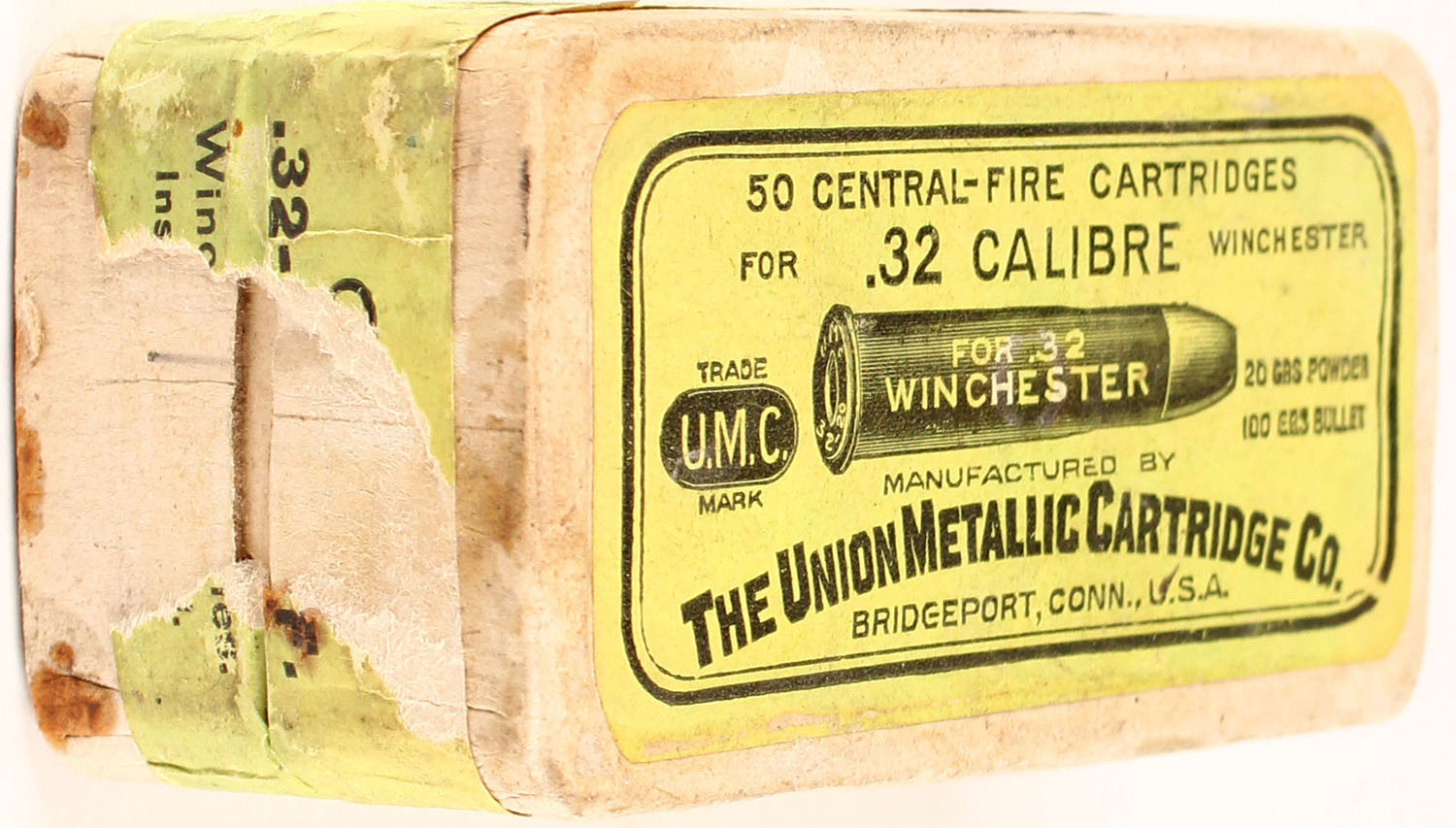 UMC, .32 Winchester, 20 Grs. Powder, 100Grs. Bullet, FULL & SEALED, 2pc. Buff box with green top & side sealing labels, box is solid with very good color, some age soiling & color fading, minor shelf wear, very minor corner wear, edges are mostly crisp, labels are 95% intact. Grade: Excellent - Value: 50 to 150