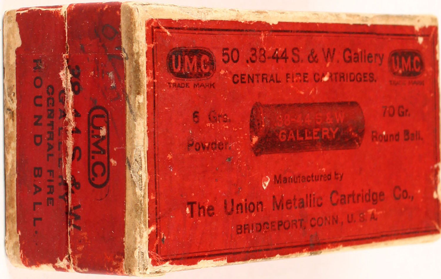 UMC, .38-44 Smith & Wesson Gallery, 6 Grs. Powder, 70 Gr. Round Ball, Full, 2pc. Buff box with red top & side sealing labels, box is solid with very good color, some age soiling, minor shelf wear, some edge & corner wear, bottom and left end have been written on, labels are intact, ammo is very good. Grade: Excellent - Value: 50 to 150