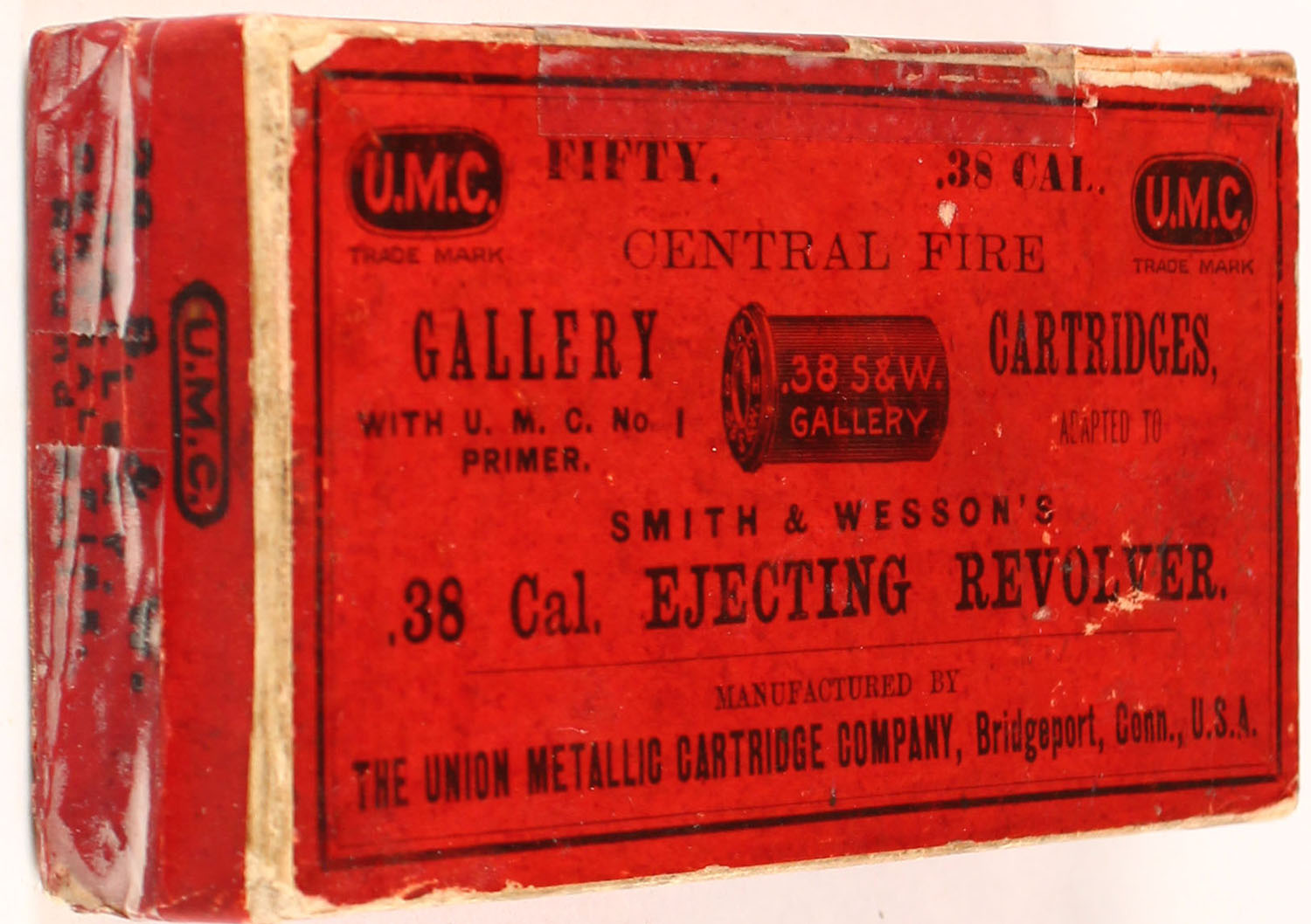 UMC, .38 Smith & Wesson Gallery Cartridges, With UMC No.1 Primer, FULL & SEALED, 2pc. Buff box with red top & side sealing labels, box is solid with excellent color, very minor age soiling, minor edge & corner wear, tape in several places, labels are intact. Grade: Excellent + - Value: 20 to 150