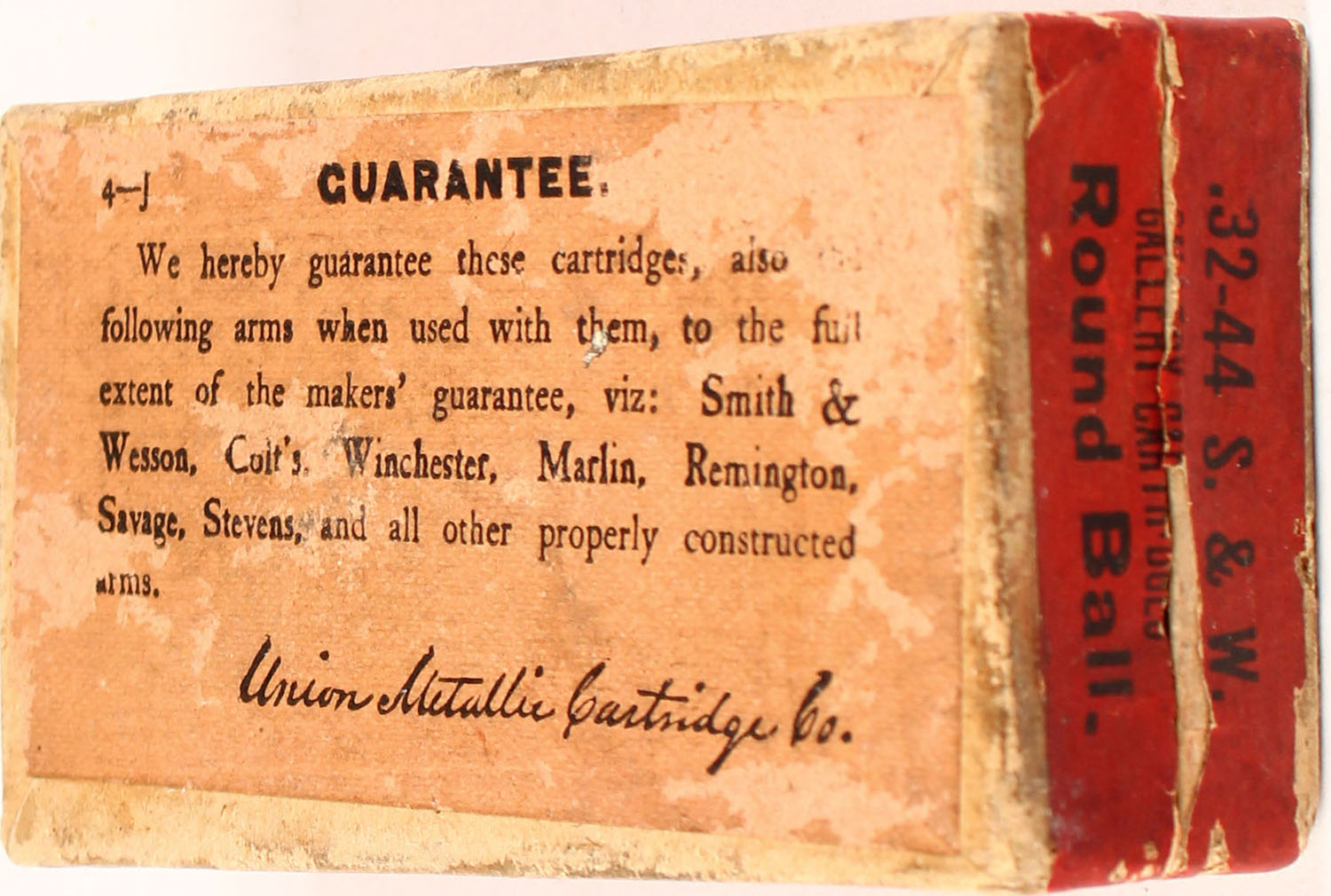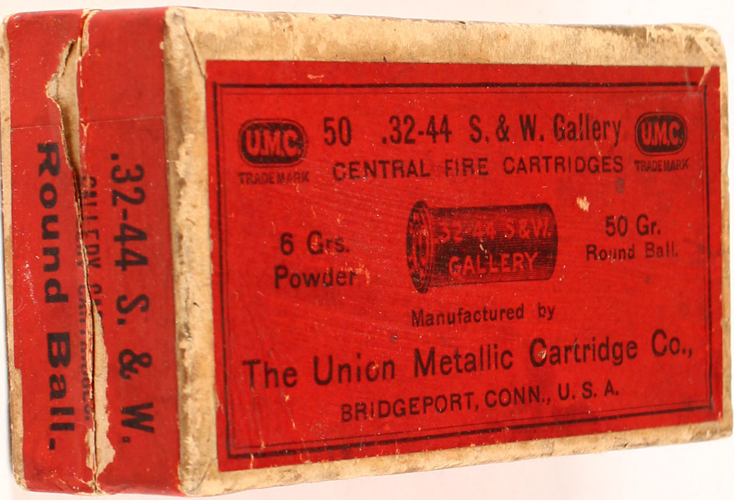 UMC, .32-44 Smith & Wesson Gallery Cartridges, 6 Grs. Powder, 50 Gr. Round Ball, Full, 2pc. Buff box with red top & side sealing labels, box is solid with very good to excellent color, some age soiling, minor edge & corner wear, labels are intact, ammo is good to very good. Grade: Excellent - Value: 20 to 150