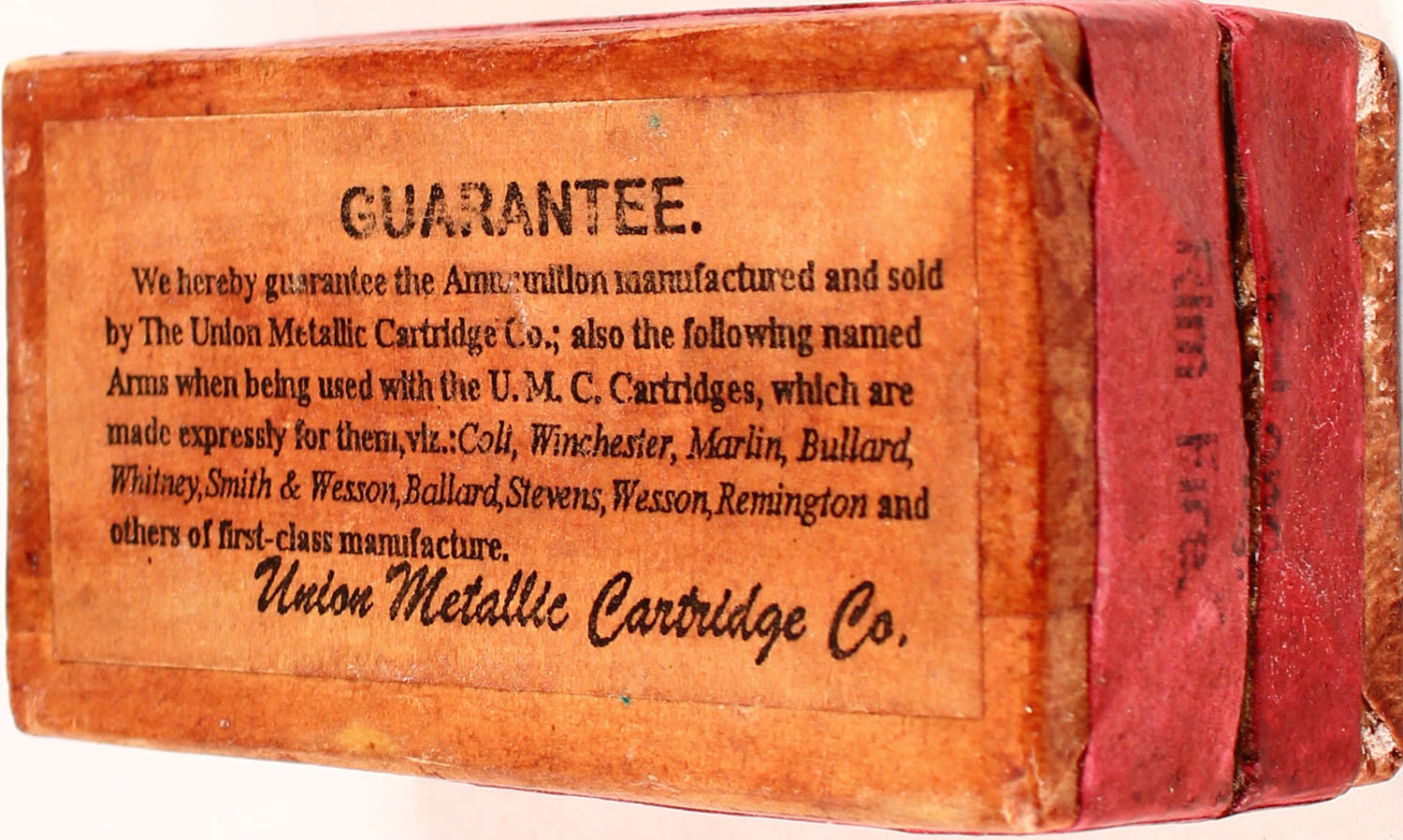UMC, .38 Long Rim Fire, Full, 2pc. Buff box with (Reproduction) Blue top & red side sealing labels, box is solid with good color, box has been coated in lacquer, age soiling, color darkening from lacquer, minor edge & corner wear, side sealing label is intact, ammo is very good. Grade: Very Good - Value: 20 to 60