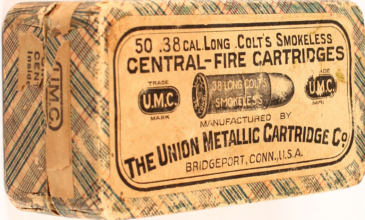 UMC, .38 Long Colt, Smokeless, Full, 2pc. Fabric box with buff top & side sealing labels, box is solid with very good color, some age soiling & shelf wear, minor edge & corner wear, side sealing label is 40% intact, ammo is very good. (564) Grade: Very Good ++ - Value: 30 to 90