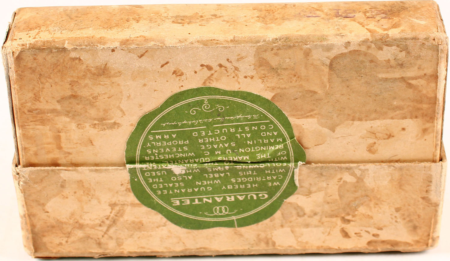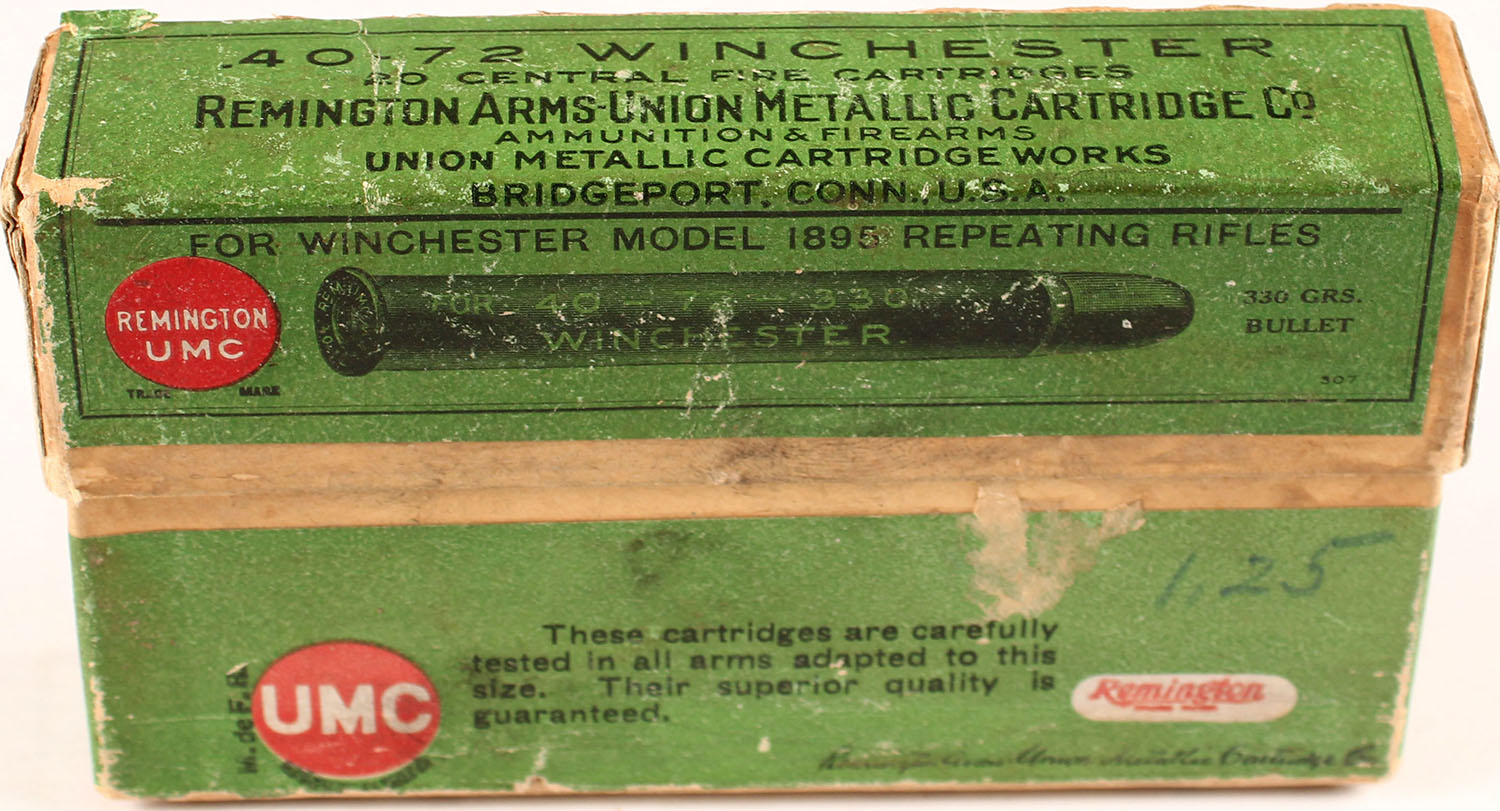 REM-UMC, .40-72 Winchester, Black Powder, 330 Grs. Bullet, FULL & SEALED, 2pc. Buff box with green labels, box is solid with excellent color, minor age soiling, some shelf wear, minor edge & corner wear, front has been written on, labels are intact. Grade: Excellent + - Value: 100 to 300
