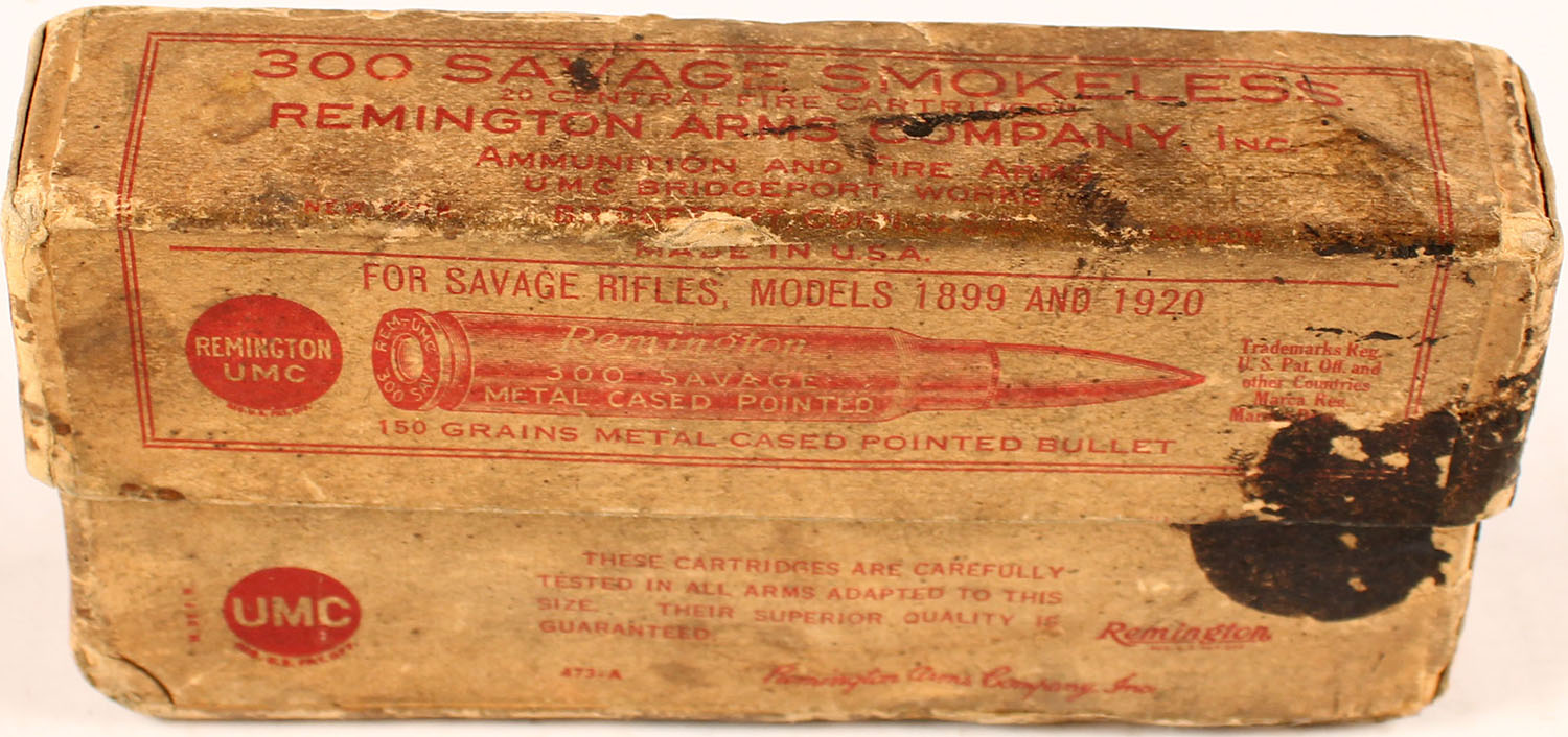 REM-UMC, .300 Savage, Smokeless, 150 Grain Metal Cased Pointed Bullet, Full, 2pc. Buff box with buff labels, box is solid with good to very good color, age soiling, some shelf wear, ink stain to front and right end, corner wear, edge wear, labels are intact, ammo is very good. Grade: Very Good - Value: 10 to 50