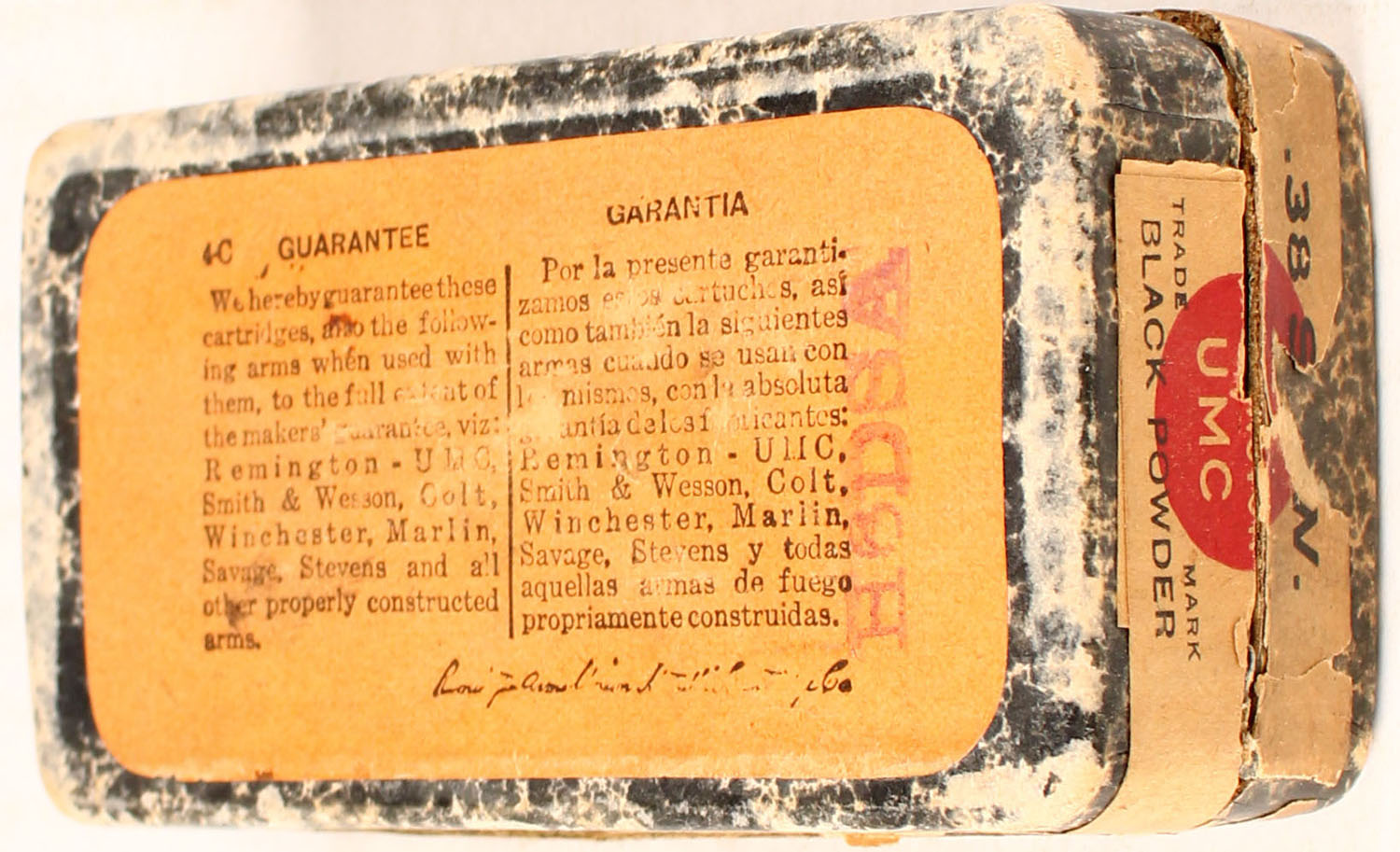 REM-UMC, .38 Smith & Wesson, Black Powder, 146 Grs. Bullet, Full, 2pc. Black mottled box with buff top & side sealing labels, box is solid with good color, age soiling, very soiled on top, some corner wear, minor edge wear, side sealing label is 75% intact, ammo is very good. Grade: Very Good + - Value: 20 to 60