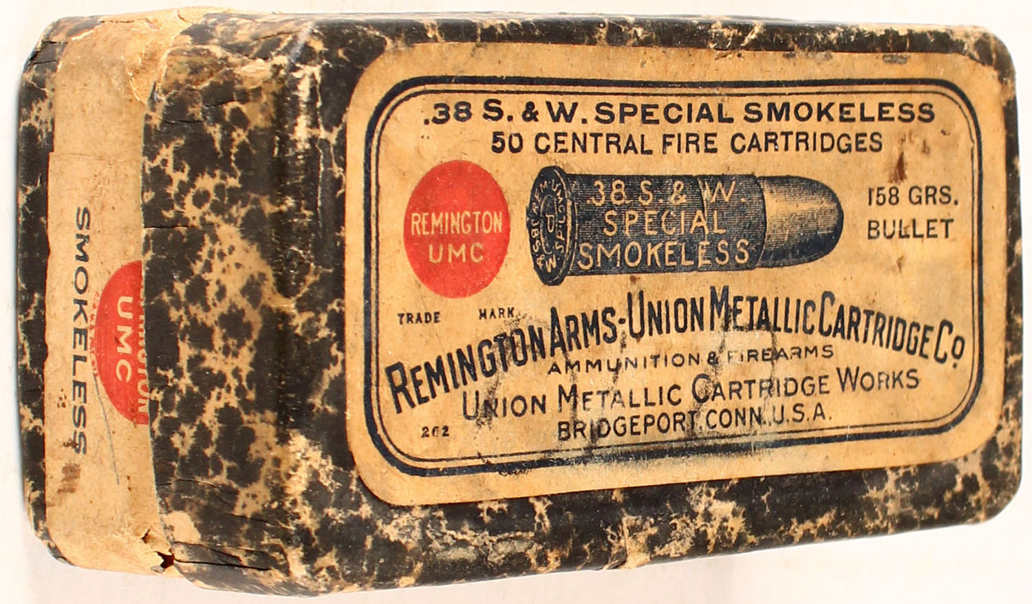 REM-UMC, .38 Special, Smokeless Powder, 158 Grain Bullet, Full, 2pc. Black mottled box with buff top & side sealing labels, box is solid with excellent color, minor age soiling, very minor shelf & corner wear, edges are crisp, side sealing label is 50% intact, ammo is excellent. Grade: Excellent + - Value: 30 to 90