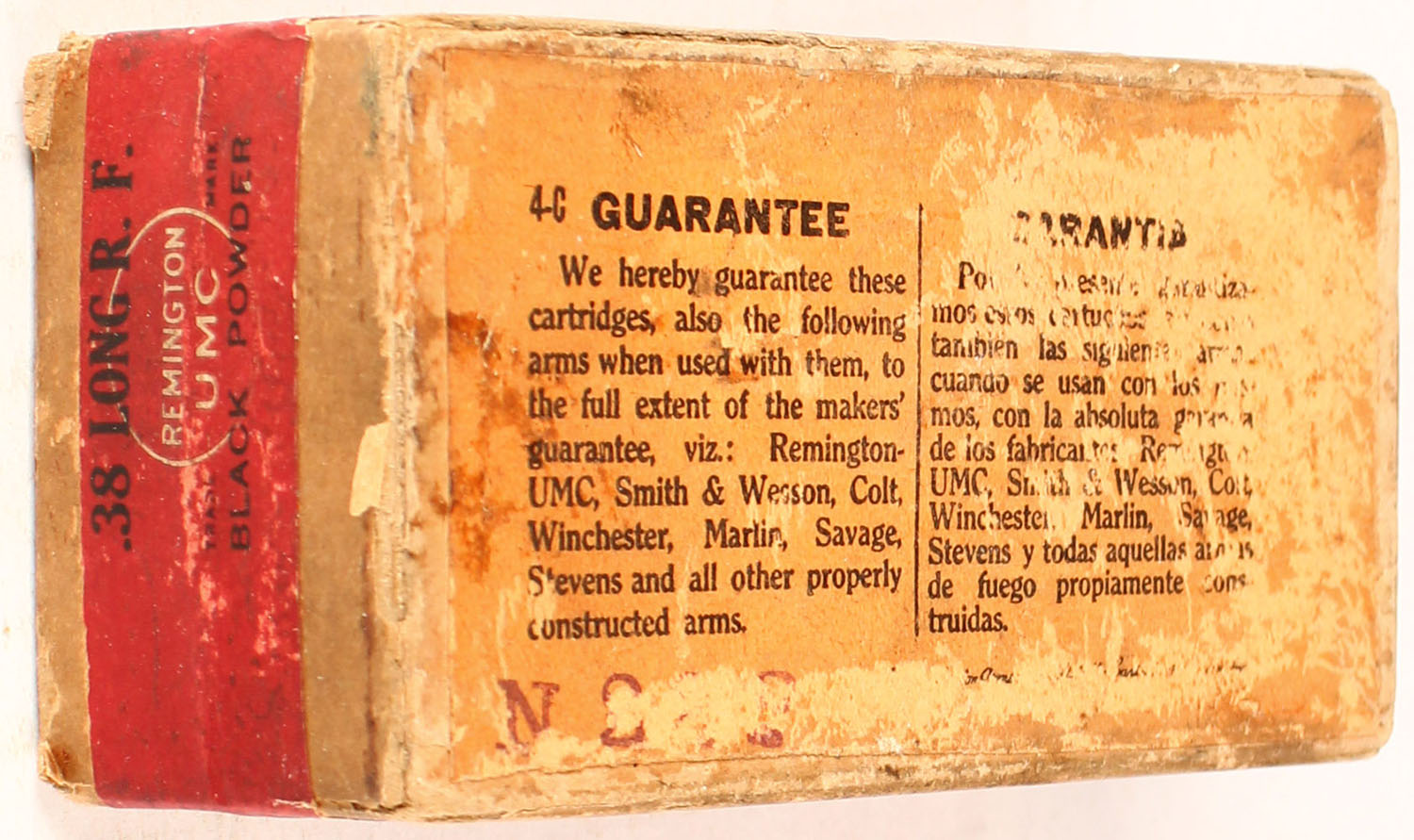 REM-UMC, .38 Long Rim Fire, Black Powder, 150 Grain Bullet, FULL & SEALED, 2pc. Buff box with green top & red side sealing label, box is solid with very good to excellent color, some age soiling & shelf wear, minor edge & corner ear, labels are intact. Grade: Excellent + - Value: 50 to 300