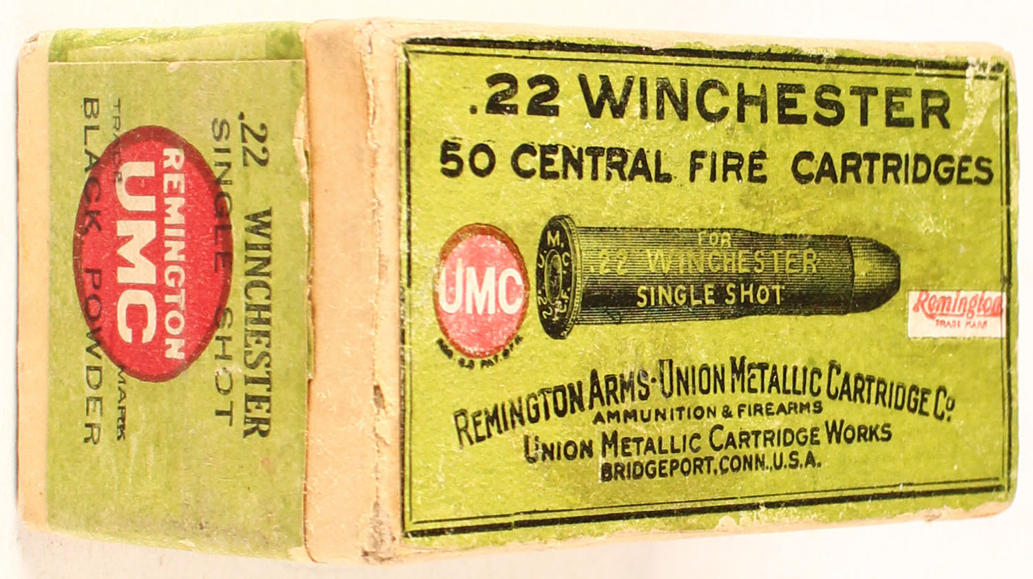 REM-UMC, .22 Winchester, Black Powder, FULL & SEALED, 2pc. Buff box with green top & side sealing labels, box is solid with excellent color, minor color fading & shelf wear, very minor corner wear, edges are mostly crisp, labels are intact. Grade: Excellent + - Value: 100 to 300