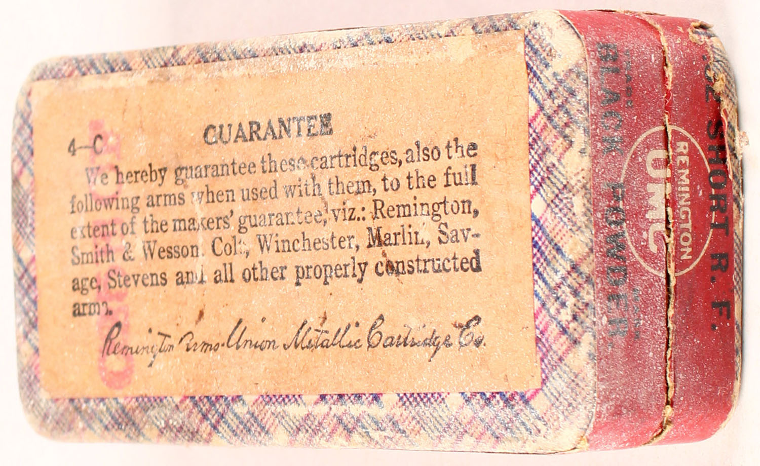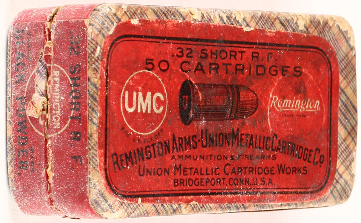REM-UMC, .32 Short Rim Fire, Black Powder, Full, 2pc. Blue fabric box with red top & side sealing labels, box is solid with very good color, age soiling, some shelf wear, minor edge & corner wear, labels are intact, ammo is good. Grade: Excellent - Value: 30 to 90