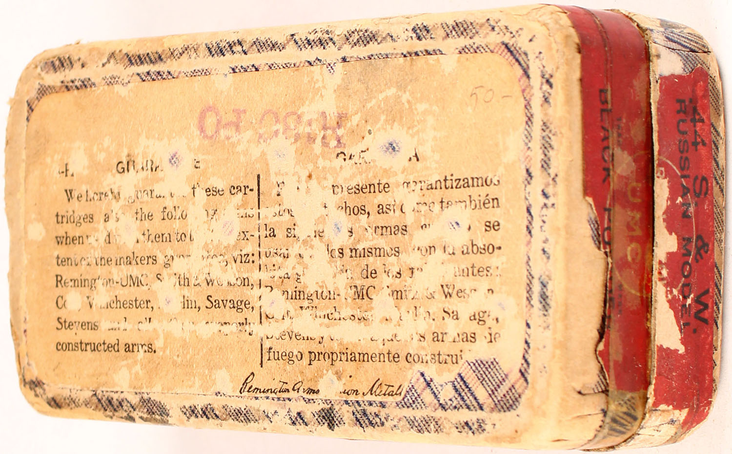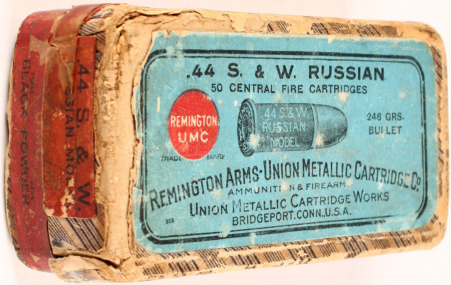 REM-UMC, .44 Smith & Wesson Russian, Black Powder, 246 Grain Bullet, Full, 2pc. Blue fabric box with blue top & red side sealing labels, box is solid with very good color, age soiling, vertical seam split to front left corner of lid, corner wear, tape on all sides of bottom of box, edge wear, side sealing label is 90% intact, ammo is very good to excellent. Grade: Very Good - Value: 50 to 150