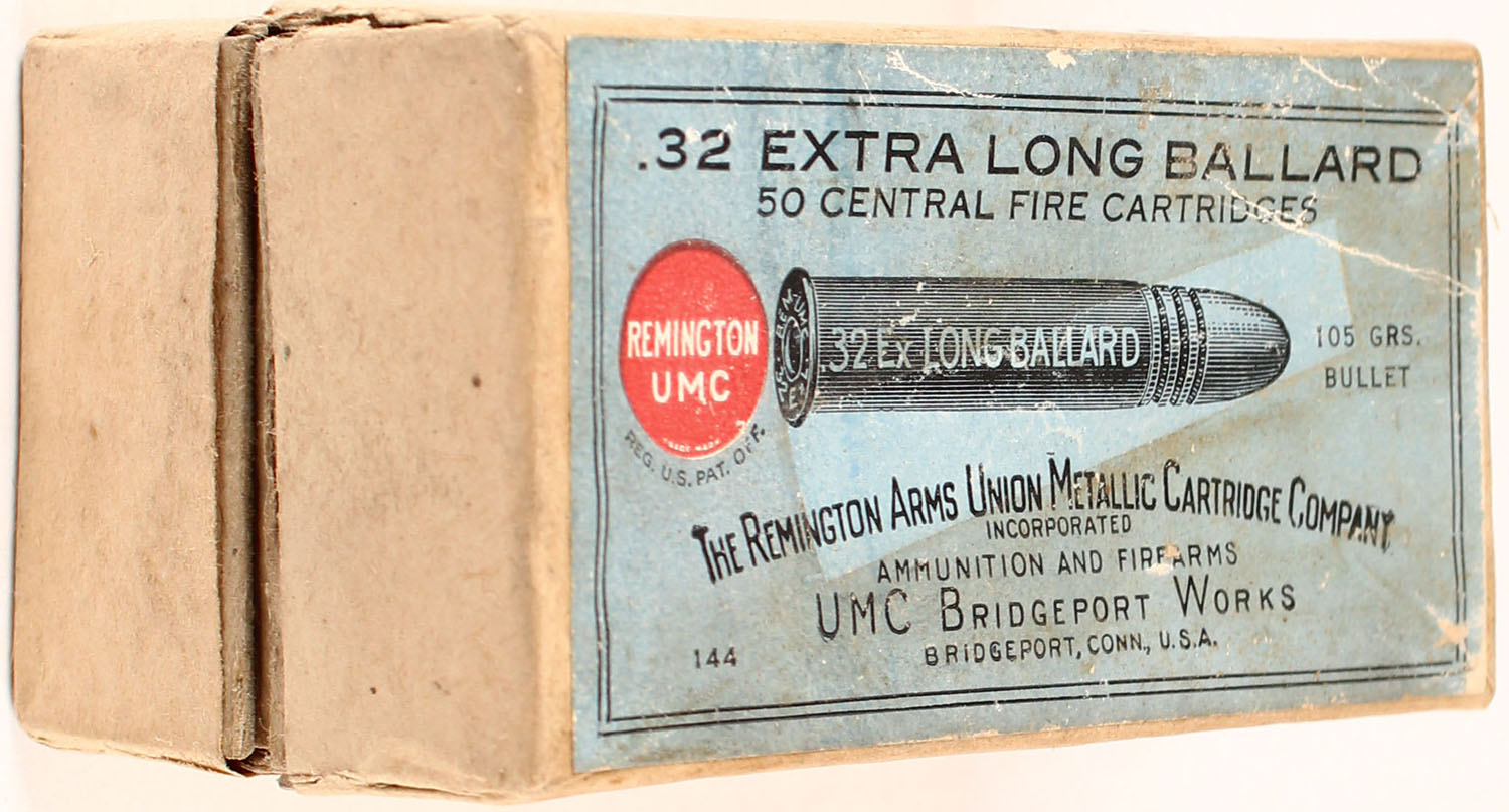 REM-UMC, .32 Extra Long Ballard (Empty Primed Shells), Full, 2pc. Buff box with blue top label, no side sealing label, ''Primed Shells'' over-label is gone, box is solid with very good color, minor age soiling & shelf wear, corners are sharp, edges are crisp, vertical seam split to back left corner of lid, ammo is excellent. Grade: Very Good ++ - Value: 10 to 50