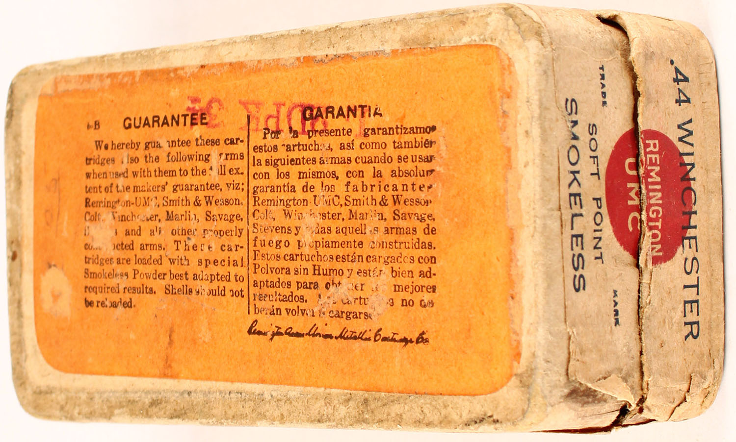 REM-UMC, .44 Winchester, Smokeless Powder, Soft Point Bullet, Full, 2pc. Buff box with buff top & side sealing label, box is solid with very good color, some age soiling & shelf wear, very minor edge & corner wear, labels are intact, ammo is excellent. Grade: Excellent - Value: 50 to 150