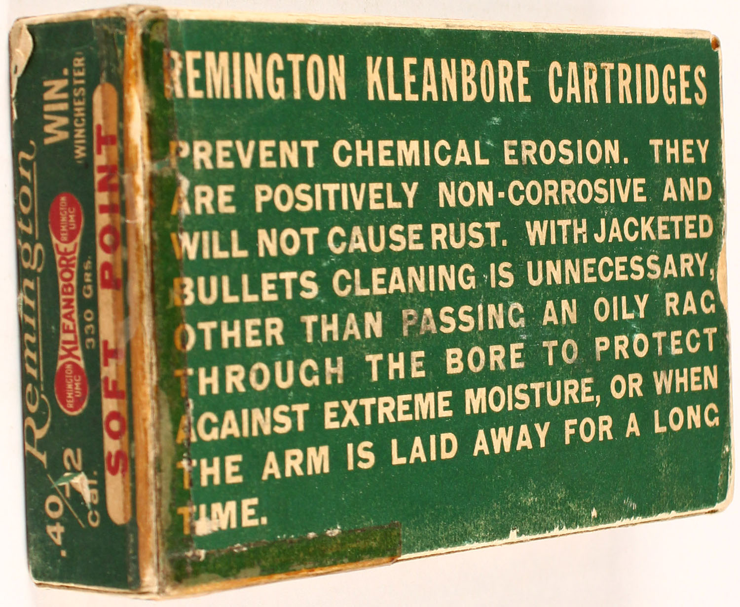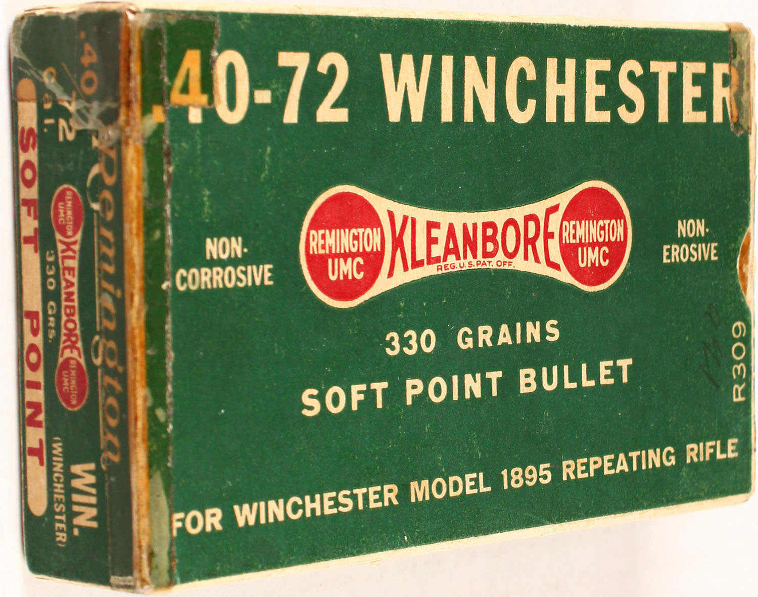 Remington, Kleanbore, .40-72 Winchester, 330 Grs. Soft Point Bullet, Partial 12 correct rds. & 8 UMC rds. of the correct caliber, 1pc. Green white & red dog bone box, box has taped on end flaps with nice colors, solid box, ammo is excellent. Grade: Very Good ++ - Value: 30 to 150
