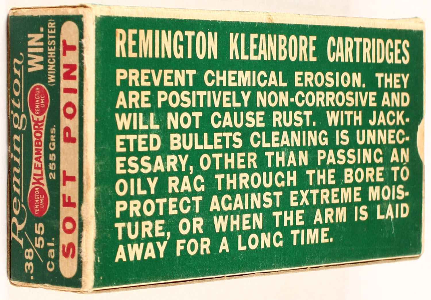 Remington Kleanbore, .38-55, 255 Gr. Soft Point Bullet, 1pc, Full, buff box with green label & white/red print, box is solid with light rub wear, ammo ranges from excellent to very good. Grade: Excellent + - Value: 40 to 150