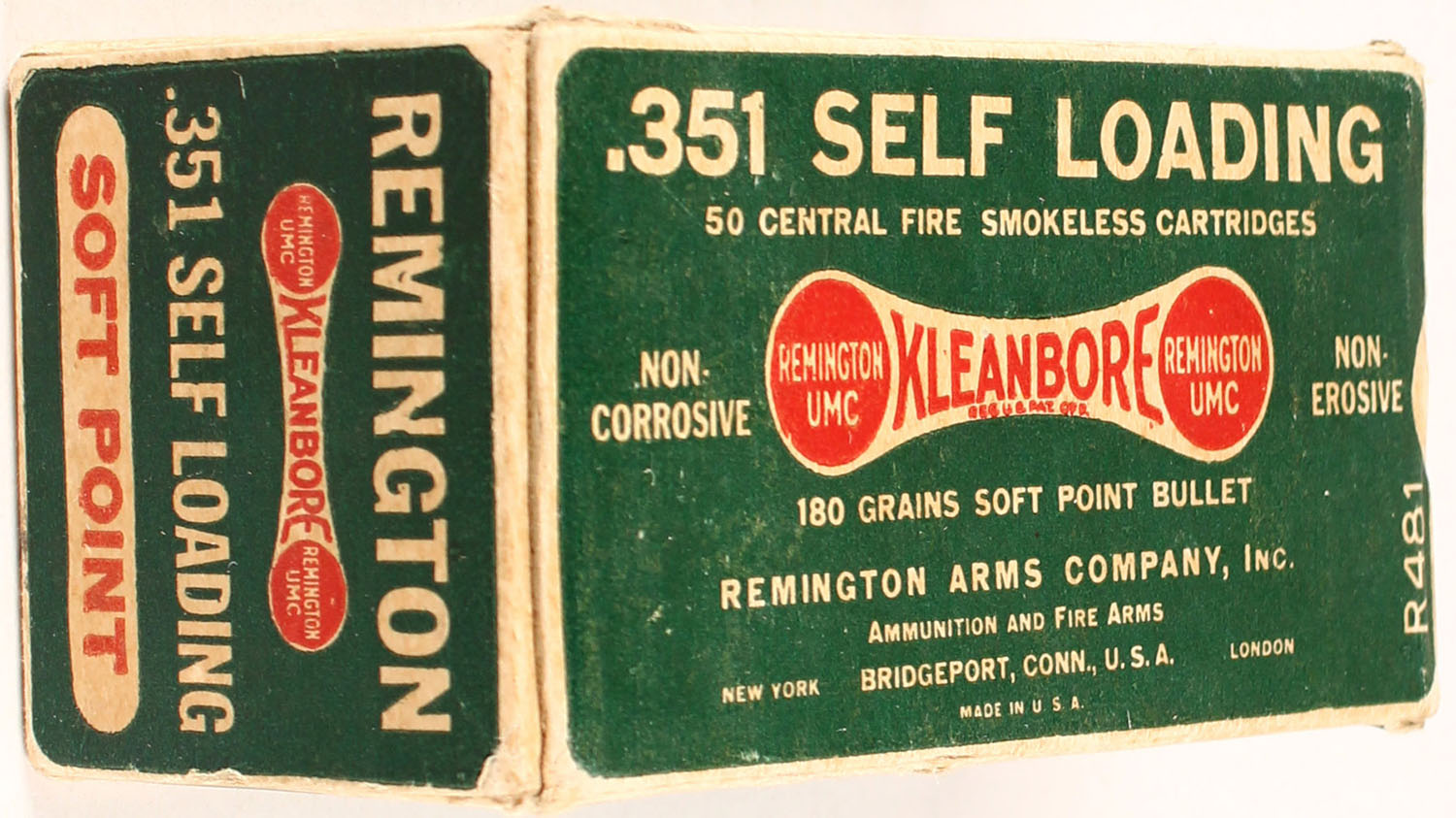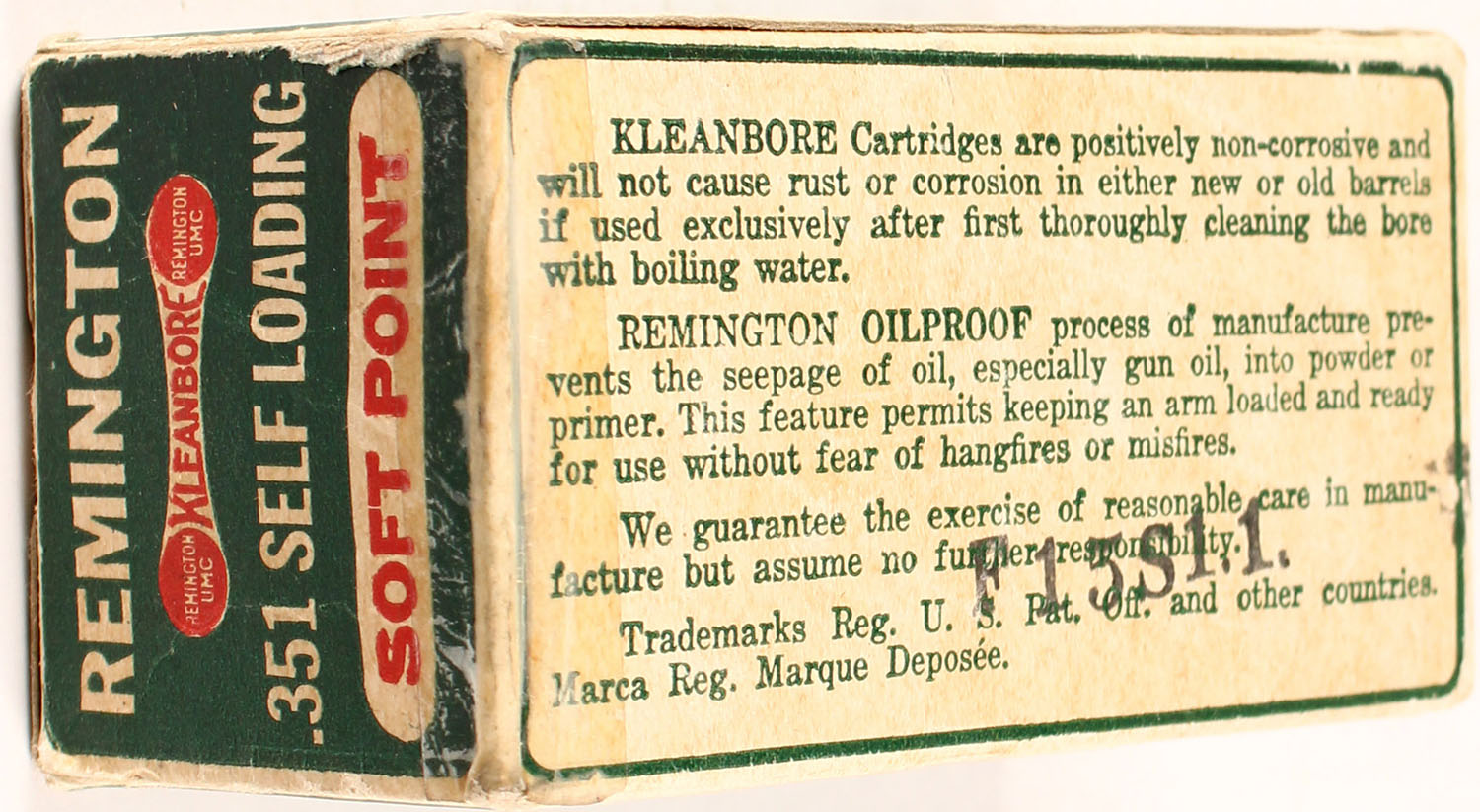 Remington Kleanbore, .351 Self Loading, 180 Gr. Soft Point Bullet, 1pc, Full, buff box with green label & white/red print, box is solid with nice colors, one flap has tape repair, ammo is excellent. Grade: Very Good ++ - Value: 30 to 200