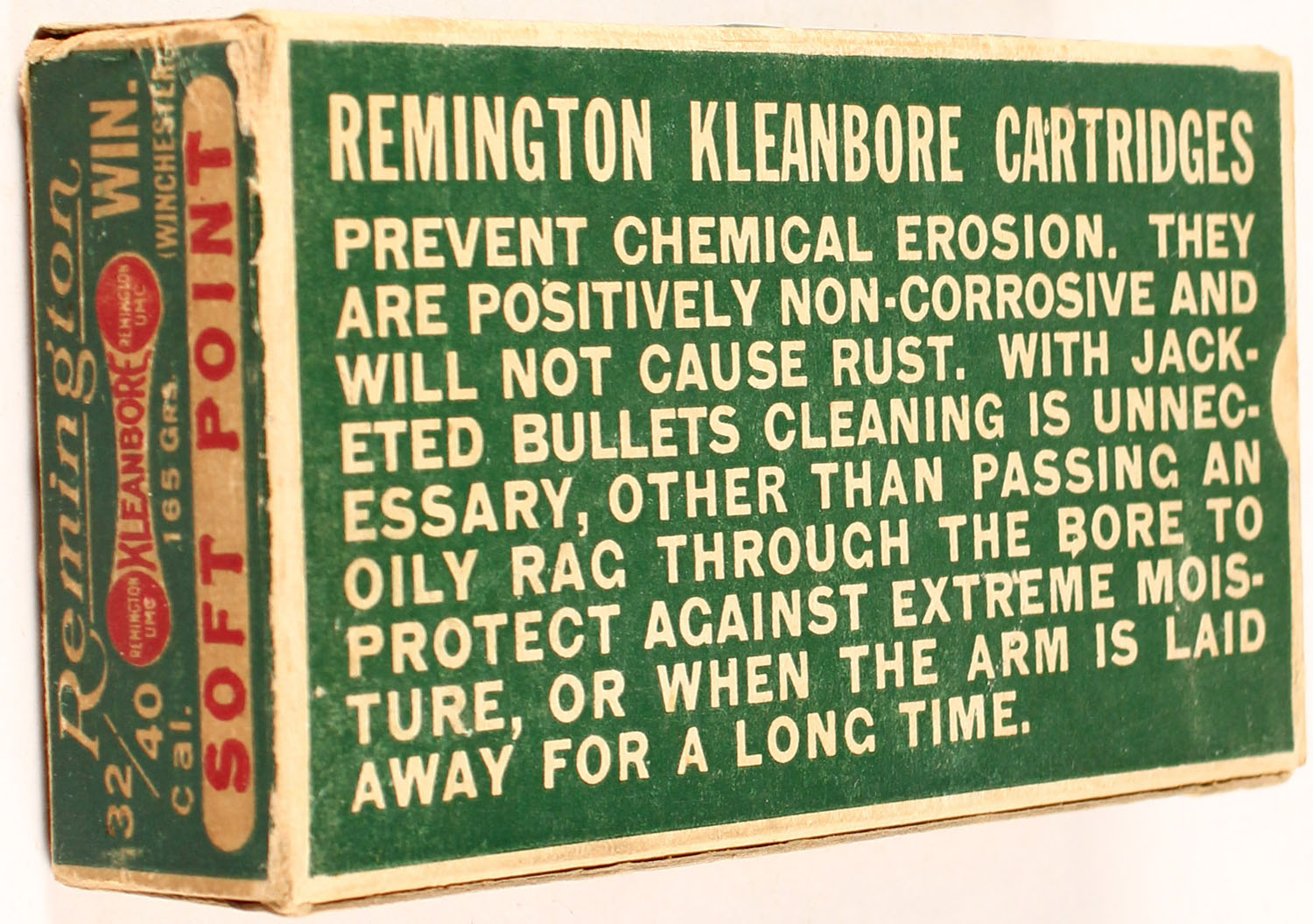 Remington Kleanbore, .32-40 Winchester, Marlin and Savage, 165 Gr. Soft Point Bullet, 1pc, Full, buff box with green label & white/red print, box is solid with light age soiling, ammo is excellent. Grade: Very Good ++ - Value: 30 to 150