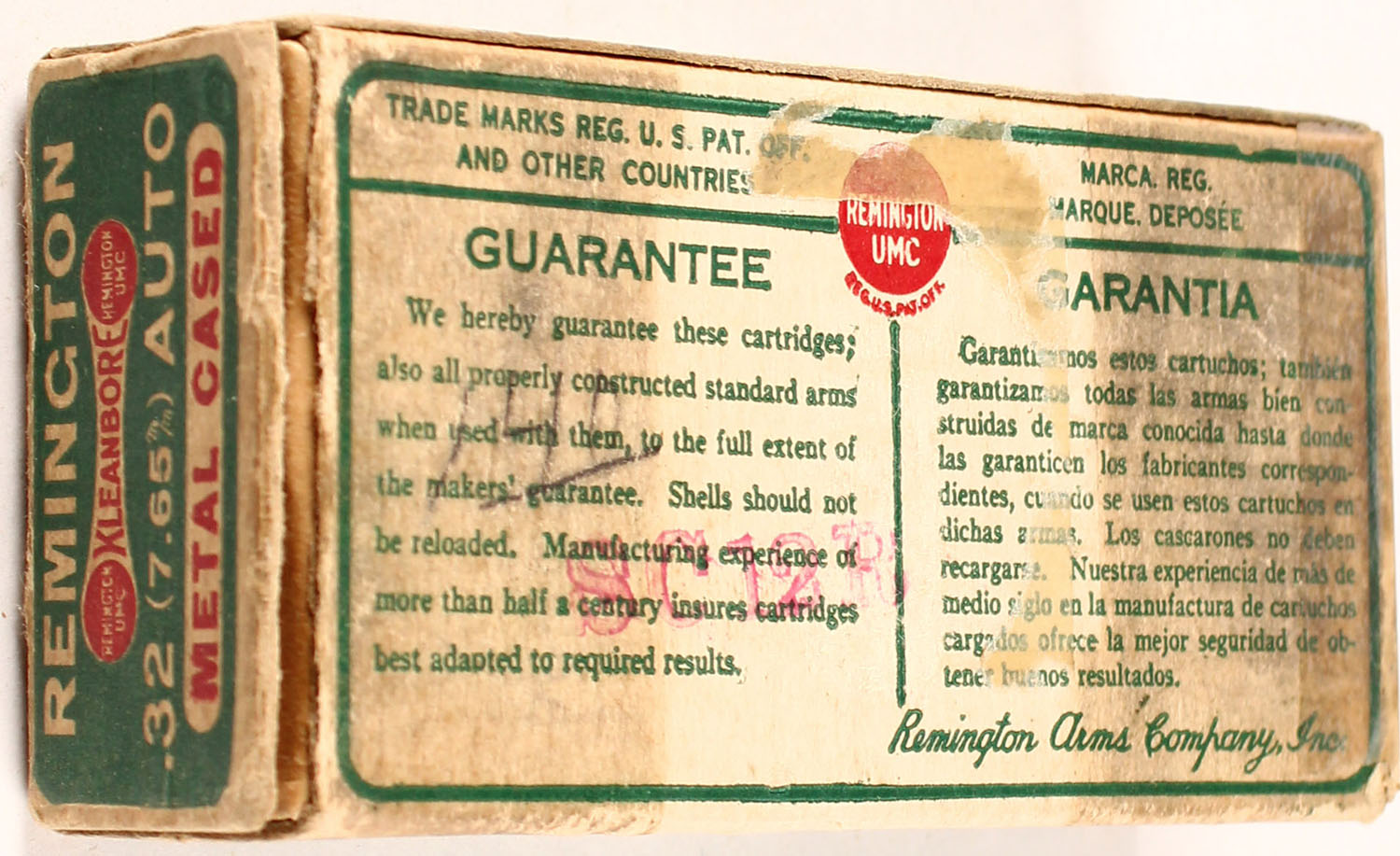 Remington Kleanbore, .32 (7.62) Automatic, 71 Gr. Metal Cased Bullet, 1pc, Full, buff box with green label & white/red print, box has one loose end flap, you can see the age soiling on both side & clean where the over label used to be, ammo is excellent. Grade: Very Good ++ - Value: 20 to 60