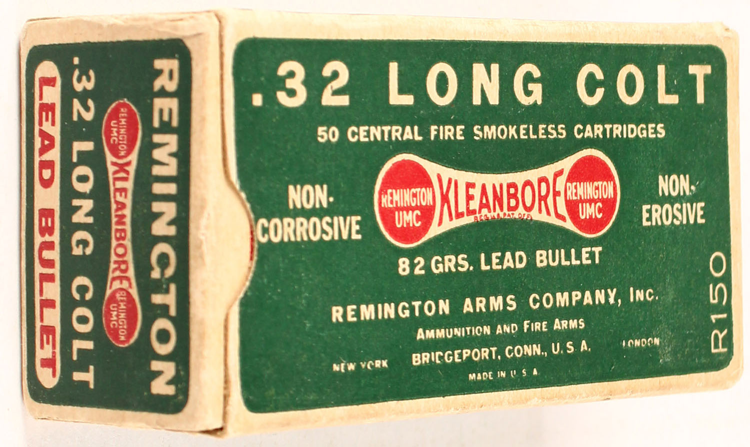 Remington, Kleanbore, .32 Long Colt, 82 Grain Lead Bullet, Full, 1pc. Green red & white box, box is solid with excellent color, end flaps are solid, ammo is excellent to minty. Grade: Excellent ++ - Value: 50 to 200