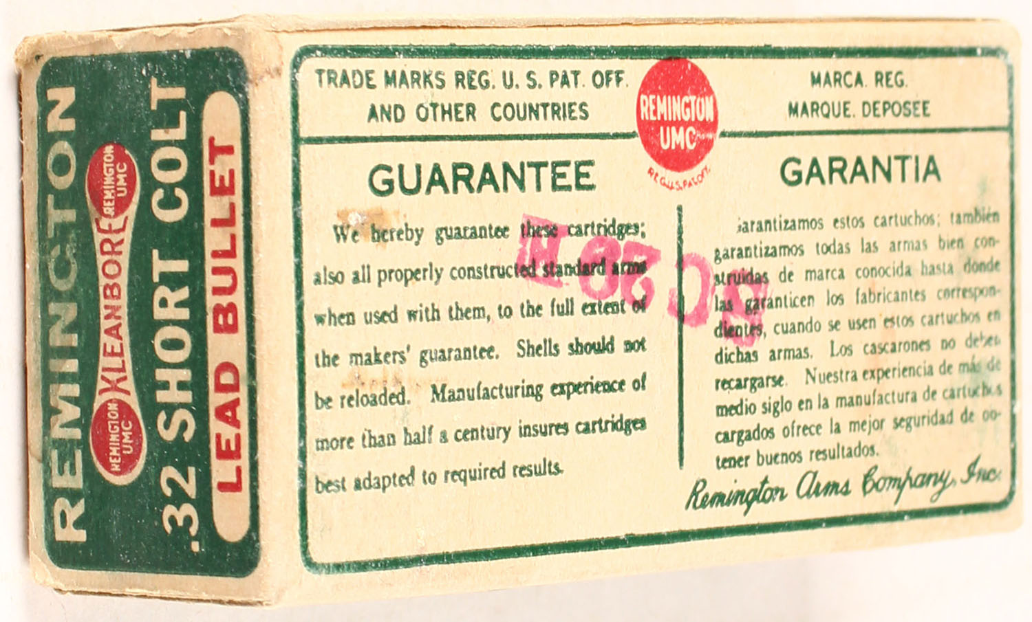 Remington, Kleanbore, .32 Short Colt, 80 Grain Lead Bullet, Full, 1pc. Green red & white box, box is solid with excellent color, end flaps are solid, ammo is nice with oxidation to the lead. Grade: Excellent - Value: 20 to 100