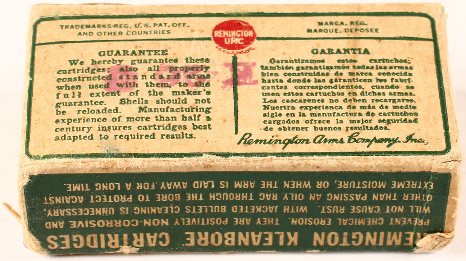 Remington, Kleanbore, .25 Stevens Short Rim Fire, Partial 44rds., 1pc. Green red & white box, box has sticker covering top of box with no end flaps, so ammo only ammo is excellent. AMMO is Grade: Excellent - Value: 20 to 100