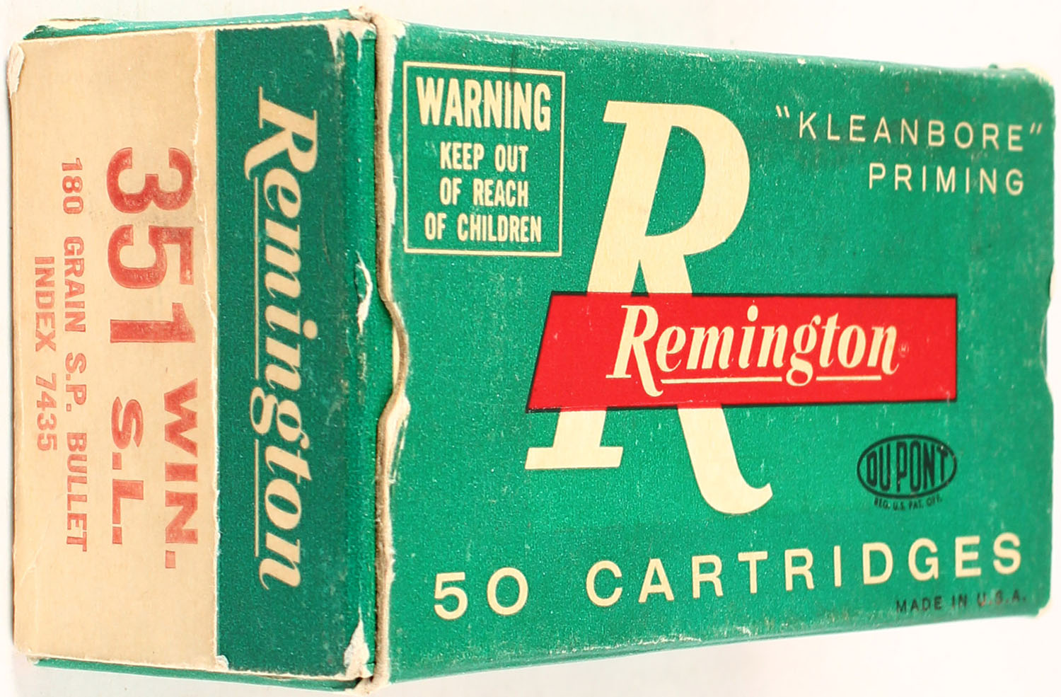 Remington, .351 WIN. S.L., 180 Gr. Soft Point, 1pc, Full, green box with red/white print, box is solid with nice colors, ammo is mint. Grade: Excellent + - Value: 30 to 150